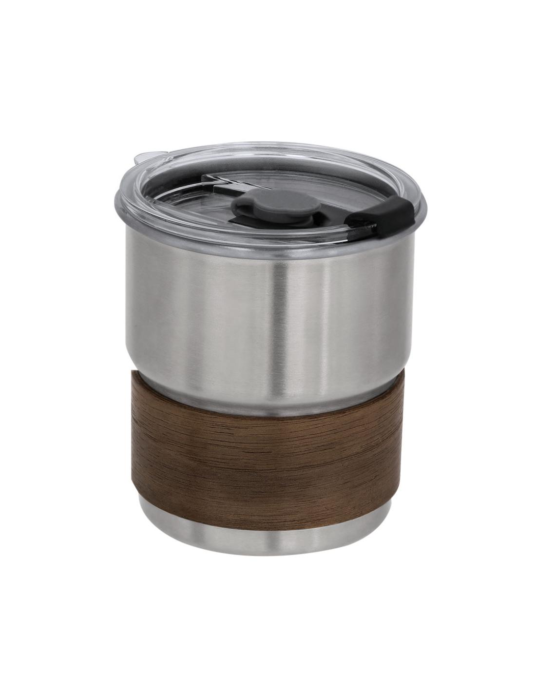 Vaso fabricado en acero inox y sofisticada madera. Con 250 ml de capacidad. Incluye elegante banda de madera. Incluye tapadera transparente hermética con dosificador en tapa y agujero para pajitas, libre de BPA.