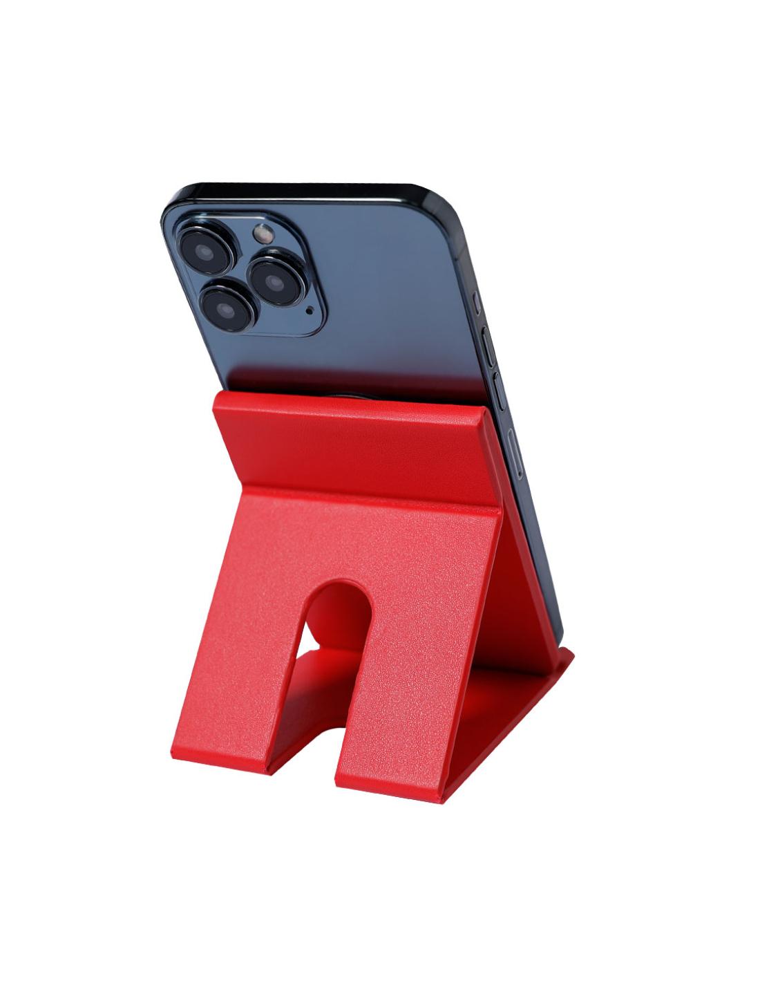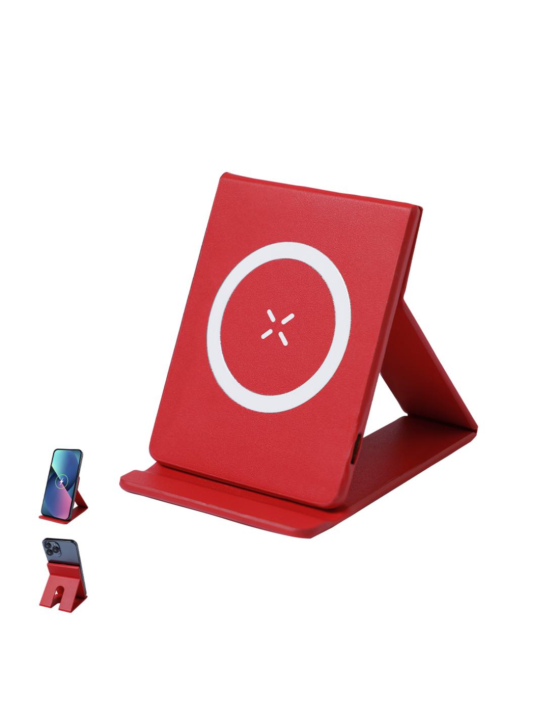 Cargador inalámbrico magnético 15W, fabricado en PU. Incluye soporte plegable, con posibilidad de varias posiciones del smartphone, e indicador de estado de carga. Compatible con terminales equipados con tecnología de carga inalámbrica. Contiene cable de carga USB de 1m, con conector de entrada Tipo C, y anillo metálico con adhesivo. Disponible manual de instrucciones en español e inglés.