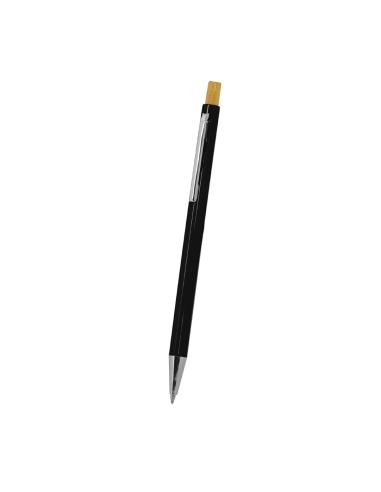 Elegante bolígrafo con pulsador fabricado en bambú. Cuerpo en resistente ABS, clip metálico, con mecanismo pulsador y en tinta azul.Materiales como el bambú fomentan la utilización de materias primas naturales, reduciendo las emisiones contaminantes. Proviene de una planta de gran resistencia y versatilidad, con crecimiento y regeneración rápidos, siendo una excelente alternativa al uso de madera tradicional.