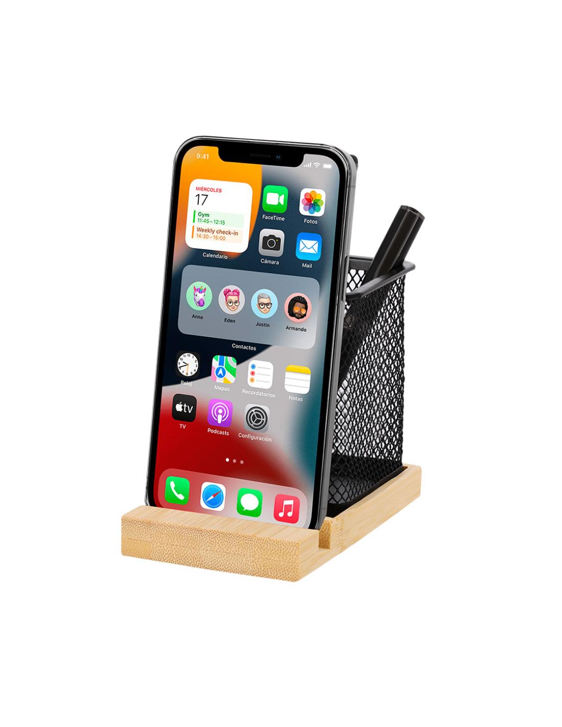 Lapicero de malla metálica con base de bambú natural. Diseñado con un práctico soporte integrado para smartphone.Materiales como el Bambú fomentan la utilización de materias primas naturales reduciendo las emisiones contaminantes. Además, el bambú proviene de una planta de gran resistencia y versatilidad, con crecimiento y regeneración rápida, siendo una excelente alternativa al uso de madera tradicional.