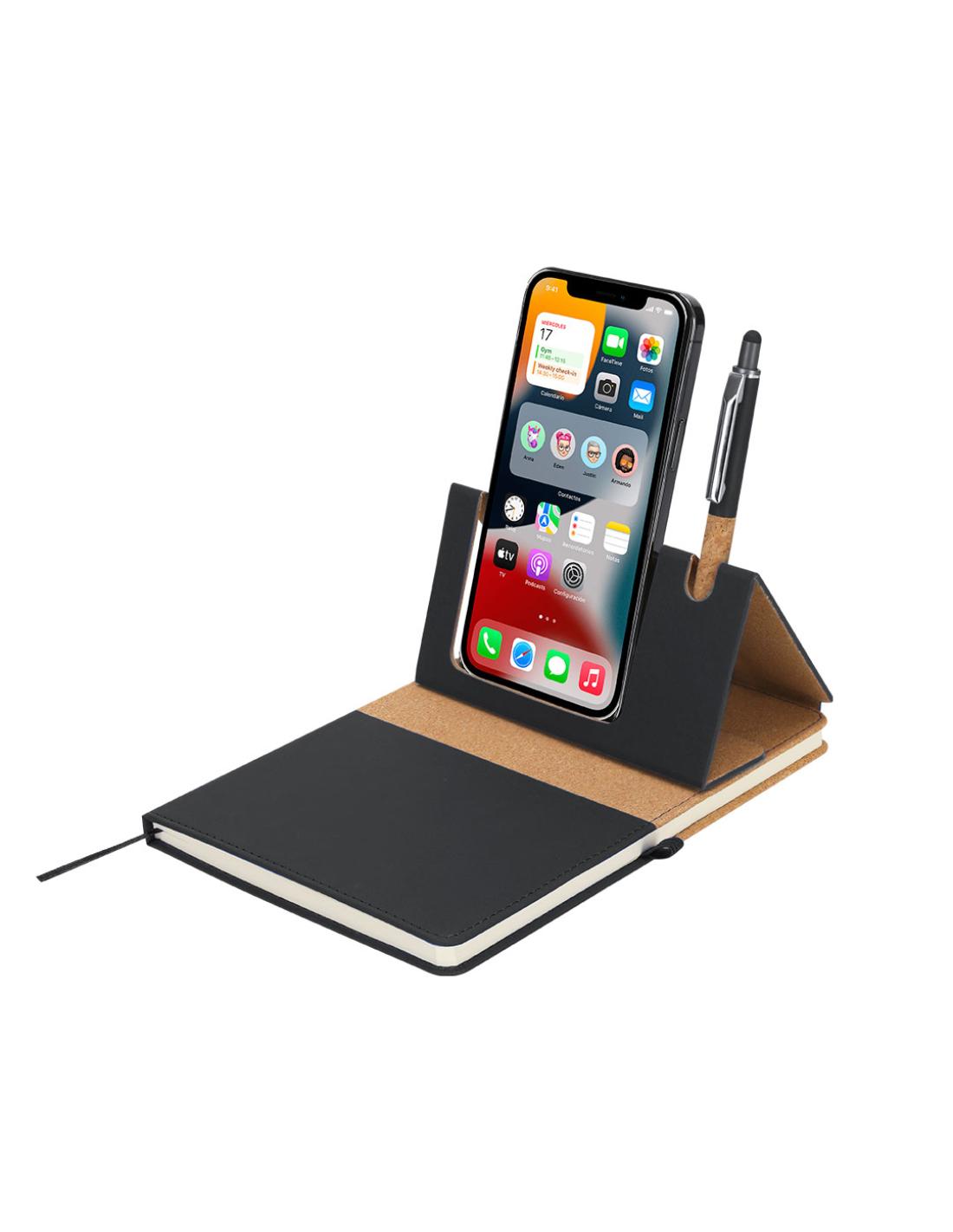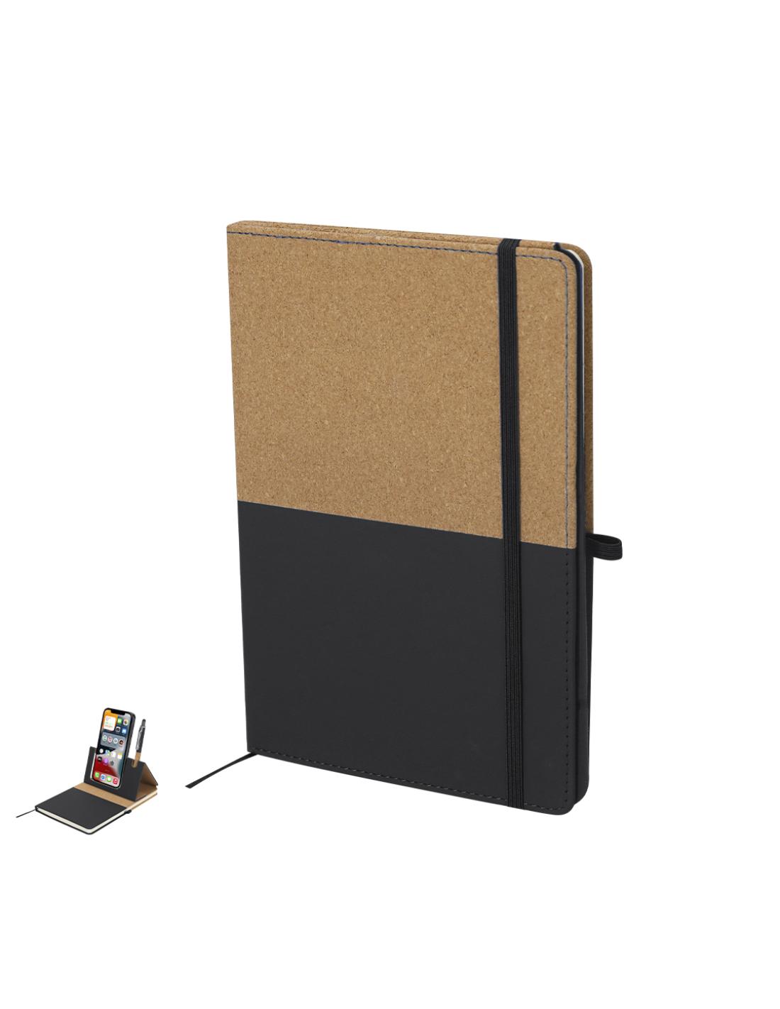 Bloc soporte con tapas rígidas fabricadas en combinación de PU Reciclado y corcho, con versátil soporte magenético en el interior portada para dispositivos móviles en corcho. Cuenta con elástico de cierre, marcapáginas negro y soporte para bolígrafo a juego de color negro. Contiene 80 hojas interiores de disposición a una raya. Con distintivo de PU Reciclado.La PU Reciclado destaca por su resistencia y elasticidad. Este material reciclado y reciclable es una opción sostenible que rescata las fibras desechadas en los procesos de fabricación, minimizando así el desperdicio de material y contribuyendo a su vez a reducir el impacto ambiental, manteniendo a la vez sus propiedades originales.
