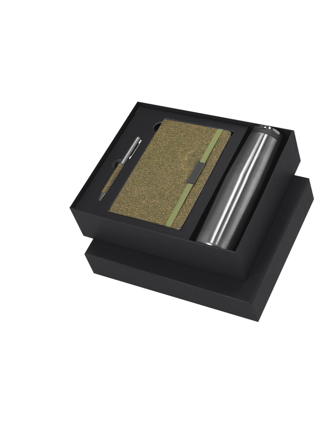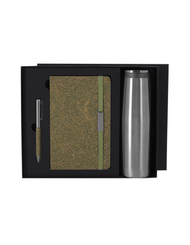 Set de bloc de notas y bolígrafo confeccionados con Fibra de Té, además de un bidón térmico fabricado en acero inox.El set incluye:- Bloc de notas de tapas rígidas, con 80 páginas rayas, banda elástica con clip metálico y marcapáginas a juego. - Bolígrafo de aluminio en acabado cromado con empuñadura de Fibra de Té, mecanismo giratorio y tinta azul. - Bidón térmico de doble pared fabricado en acero inox de 500ml. Con tapón a rosca y asa metálica. Bloc con logo Tea Grounds marcado en la parte posterior. Presentado de manera elegante en una caja negra con interior troquelado. Tea Grounds es un material sostenible creado a partir de residuos de hojas de té recicladas. Durante el procesamiento del té, se recolectan y compactan los restos para darles una segunda vida como recurso útil. Su producción fomenta...