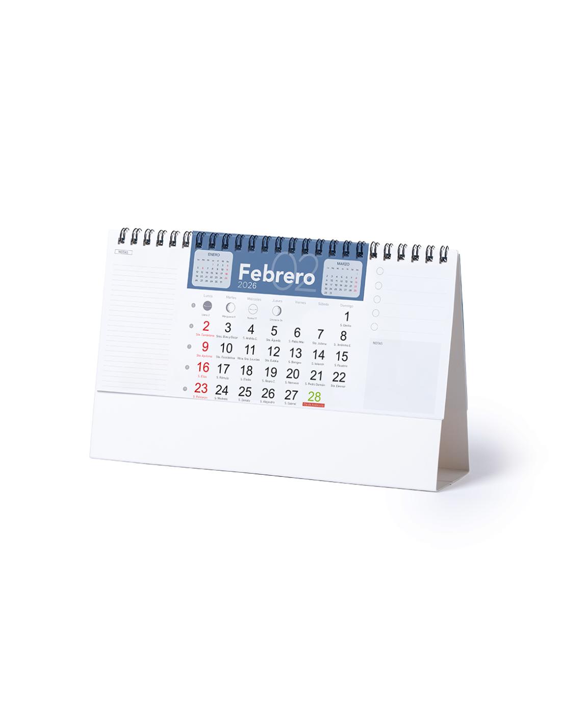 Calendario de sobremesa de anillas con cuerpo triangular en cartón. Diseño mes en curso/ mes anterior/ mes siguiente, santoral y espacio para notas. Amplia superficie de marcaje en ambas caras.