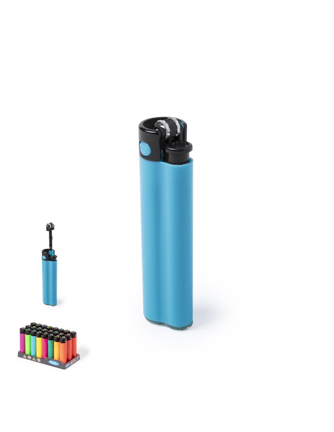 Encendedor a gas de mecanismo de piedra. Con protección infantil, recargable, regulador de llama y accesorio extraíble para prensado. Servidos en cajas expositoras de 24 unidades y en colores surtidos de acabado sólido.