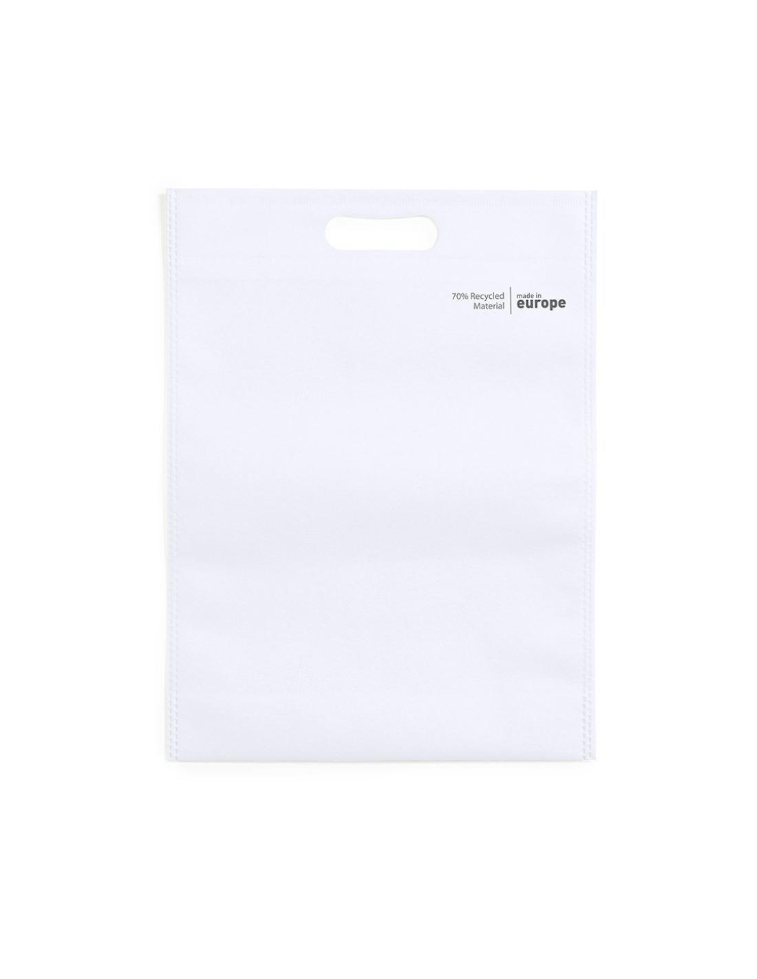 Bolsa de línea nature, fabricada en non-woven reciclado de 70g/m2. De fabricación europea, con acabado termosellado, fuelle en la base, asa reforzada troquelada y distintivo eco/made in sobre la bolsa.