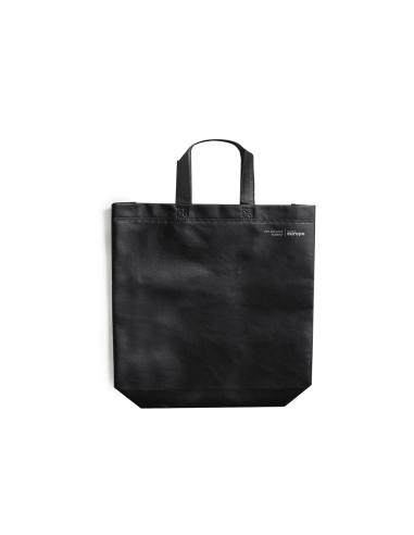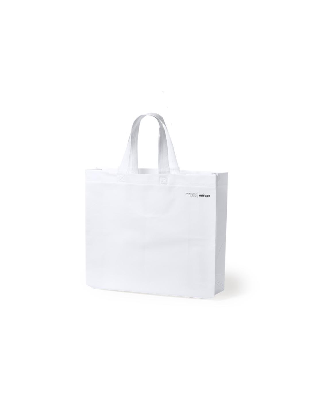 Bolsa de línea nature, fabricada en non-woven laminado reciclado de 120g/m2. De fabricación europea, con acabado termosellado, con fuelle, asas largas y distintivo eco/made in sobre la bolsa.