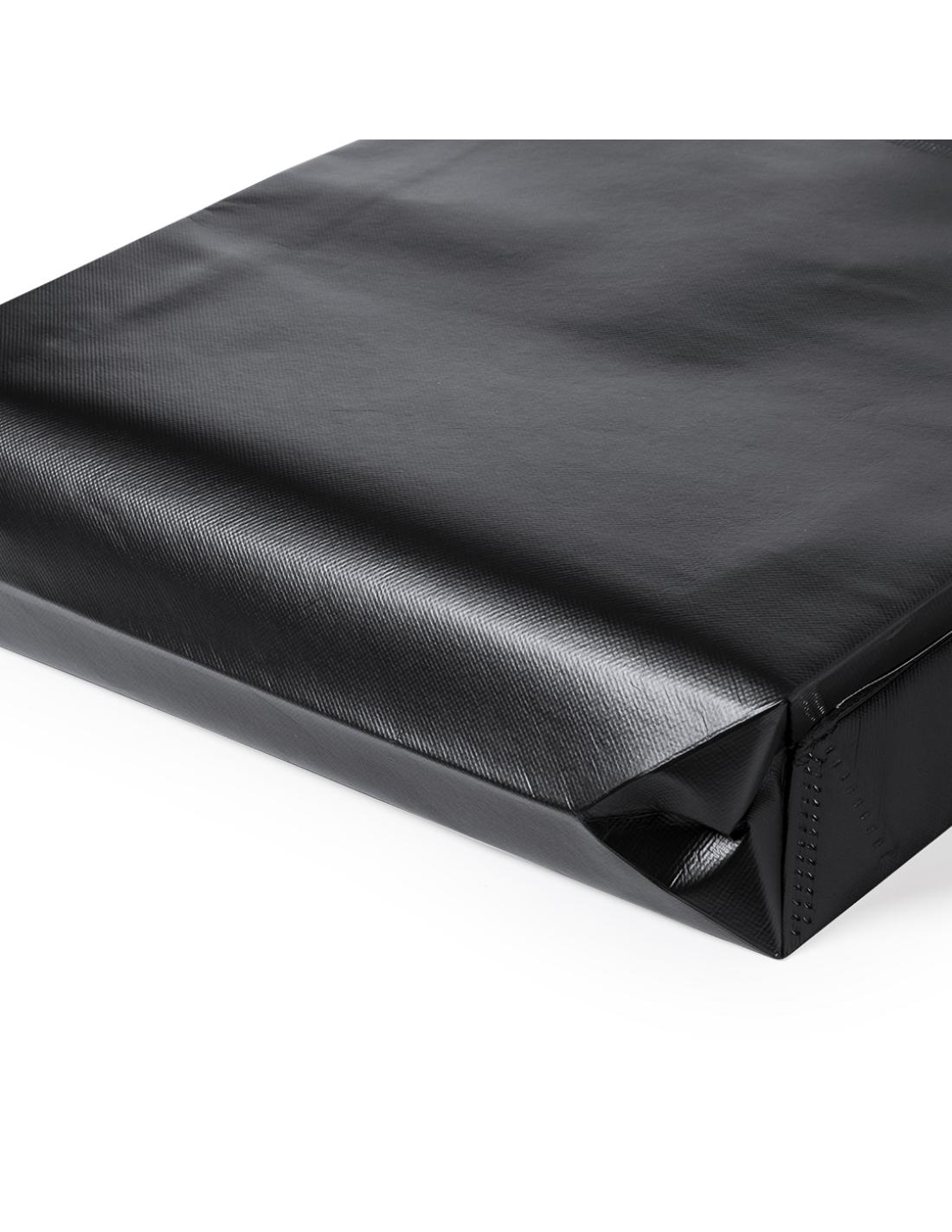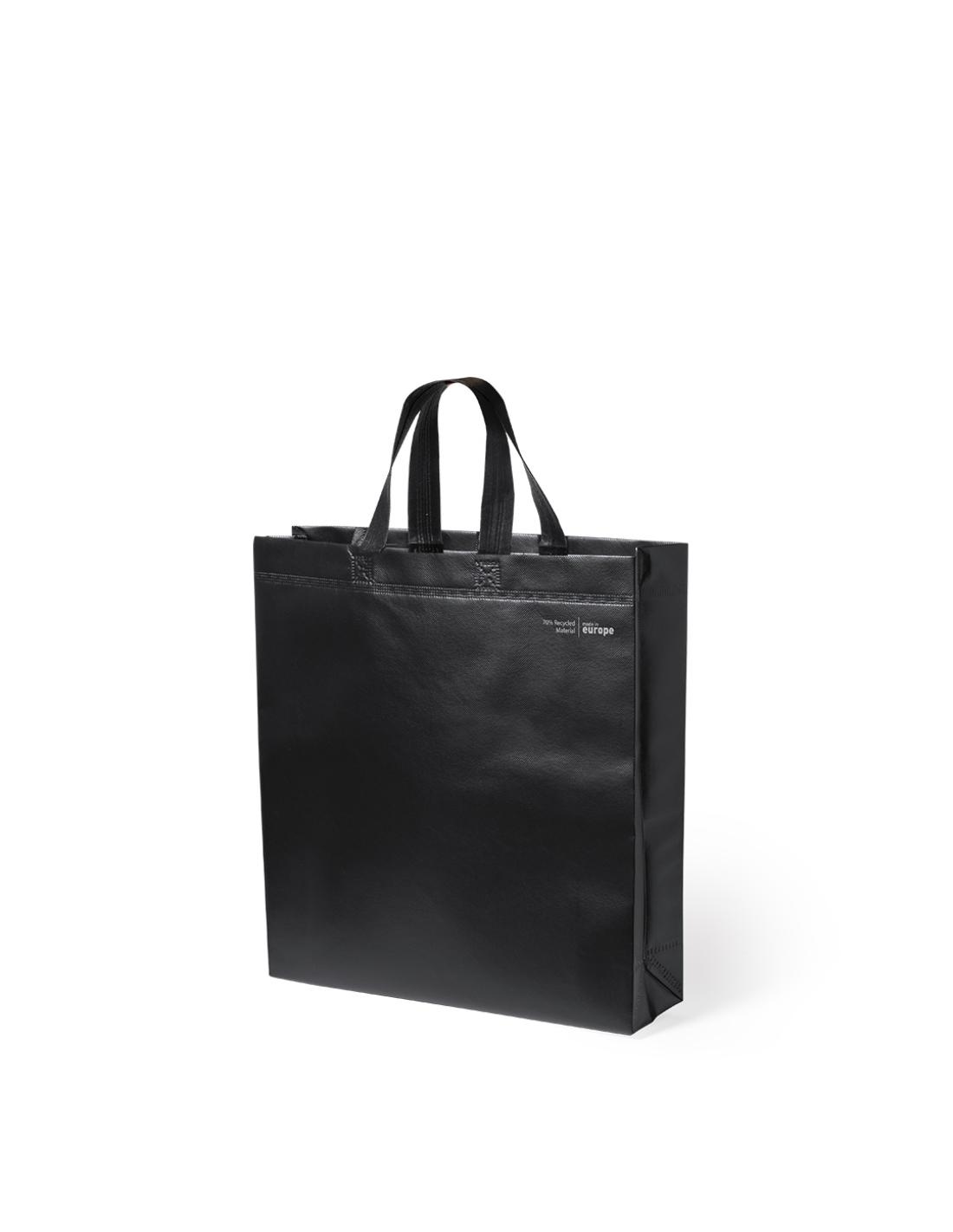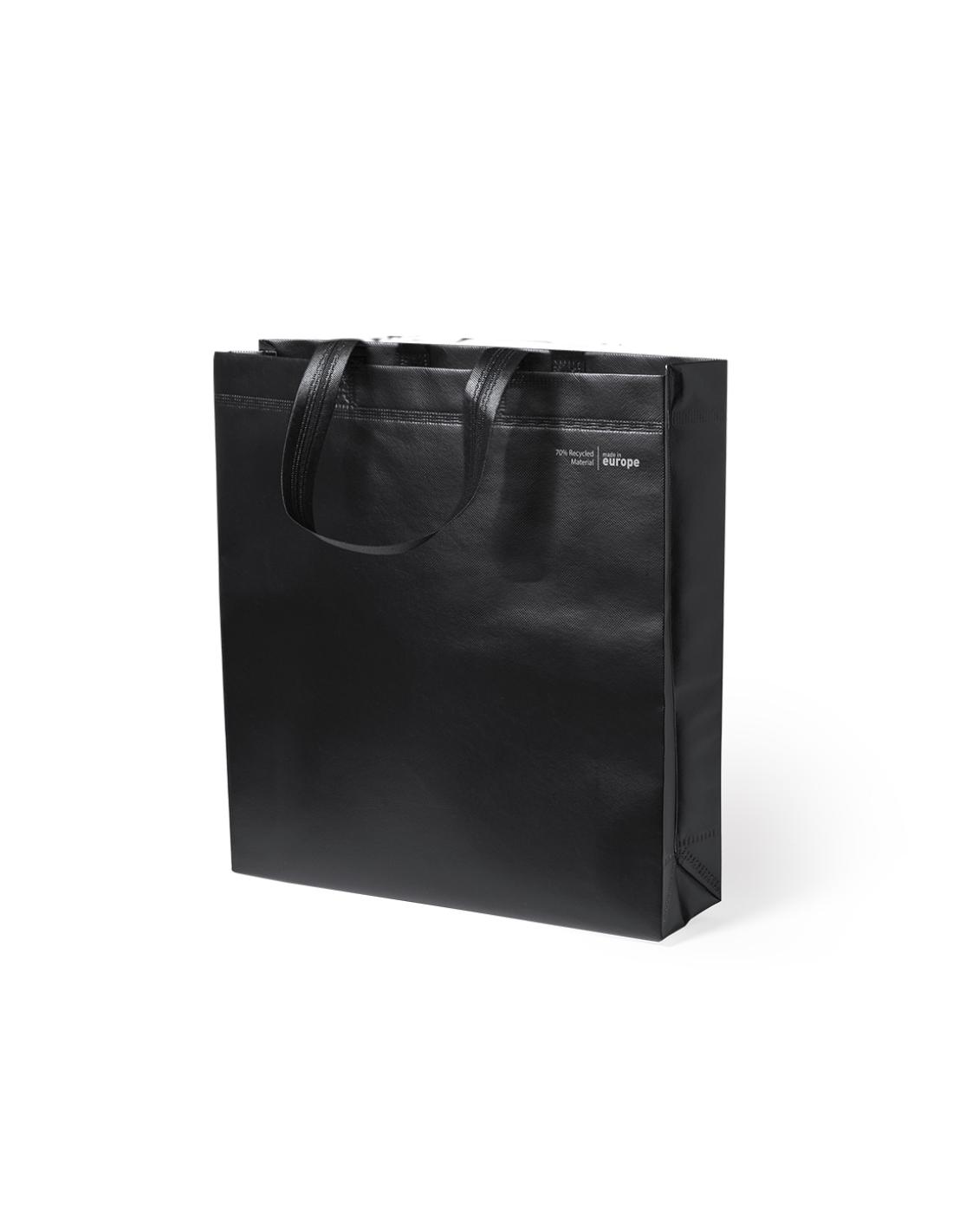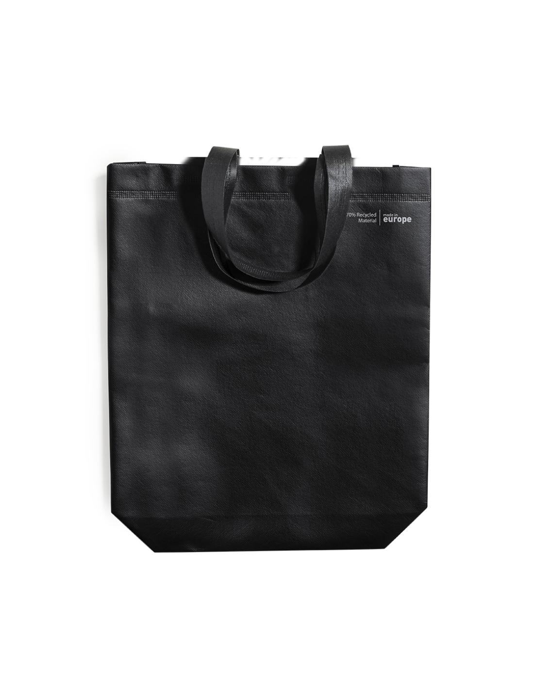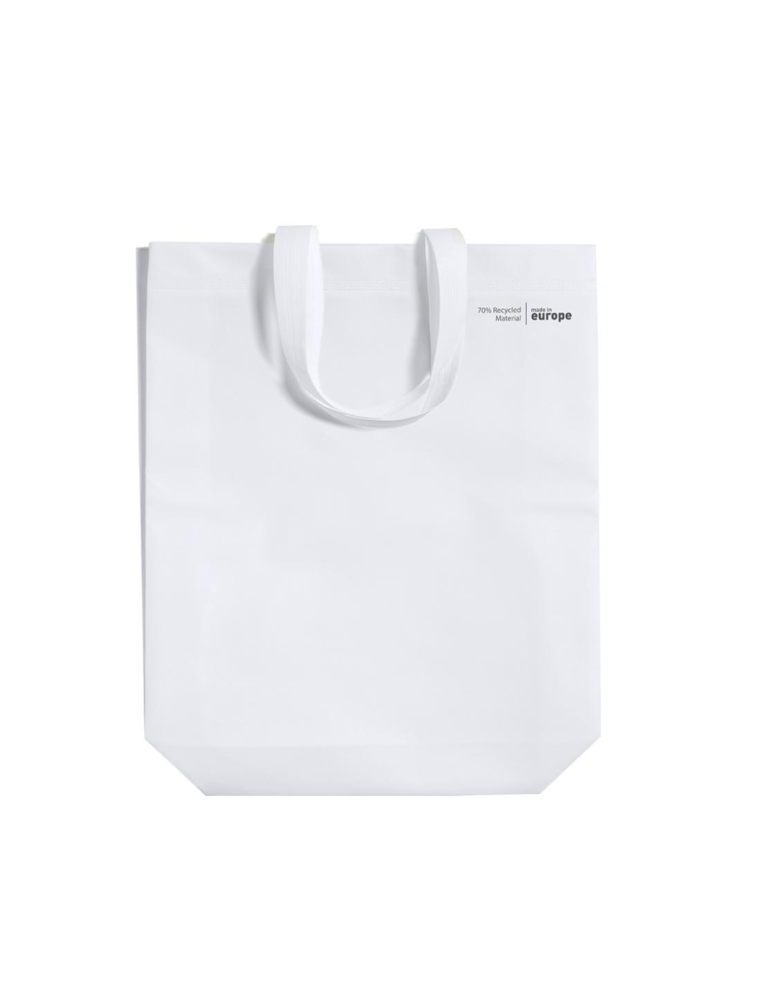Bolsa de línea nature, fabricada en non-woven laminado reciclado de 120g/m2. De fabricación europea, con acabado termosellado, con fuelle, asas largas y distintivo eco/made in sobre la bolsa.