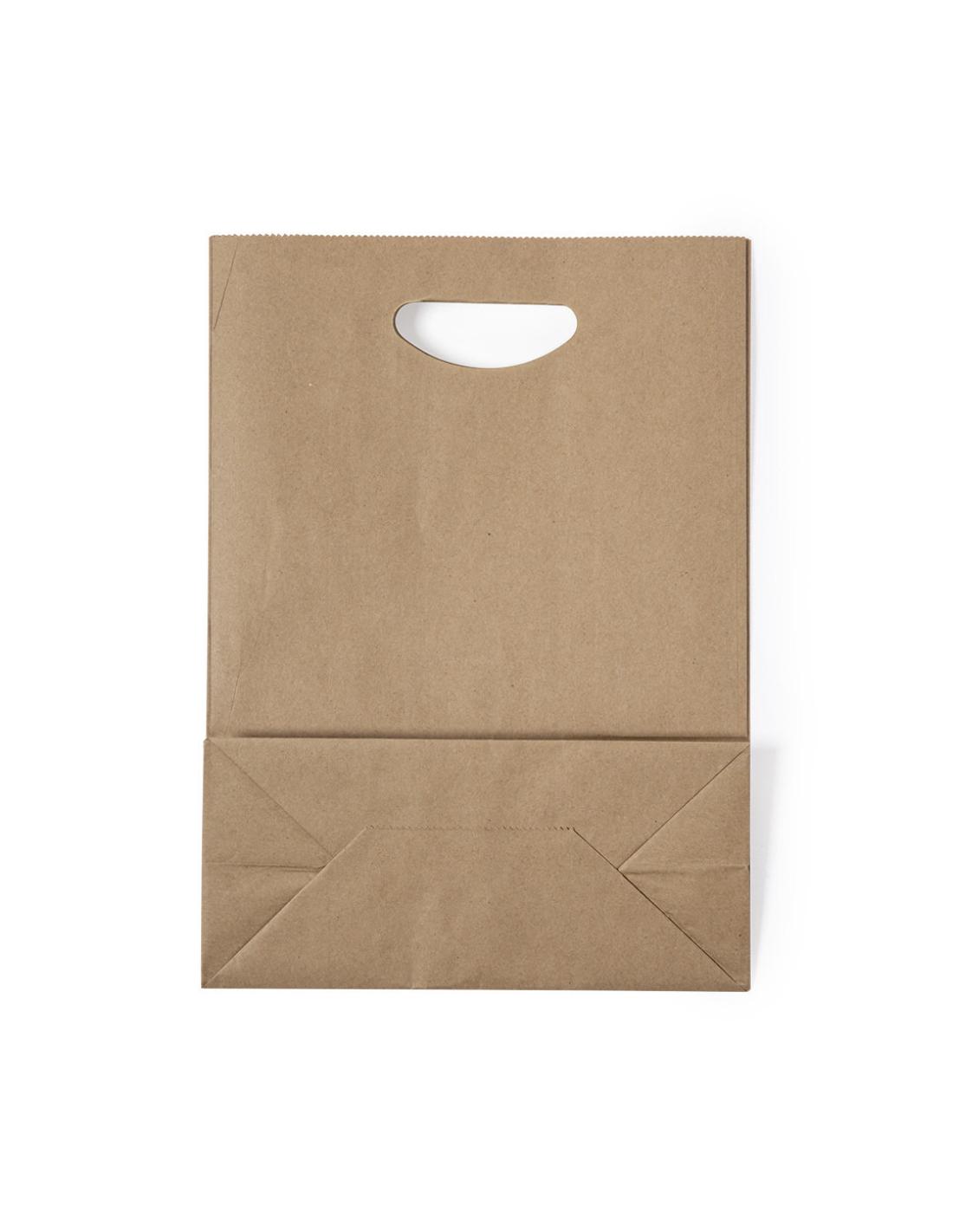 Bolsa ligera de línea nature fabricada en papel reciclado de 80g/m2. Con original asa troquelada y fuelle.
