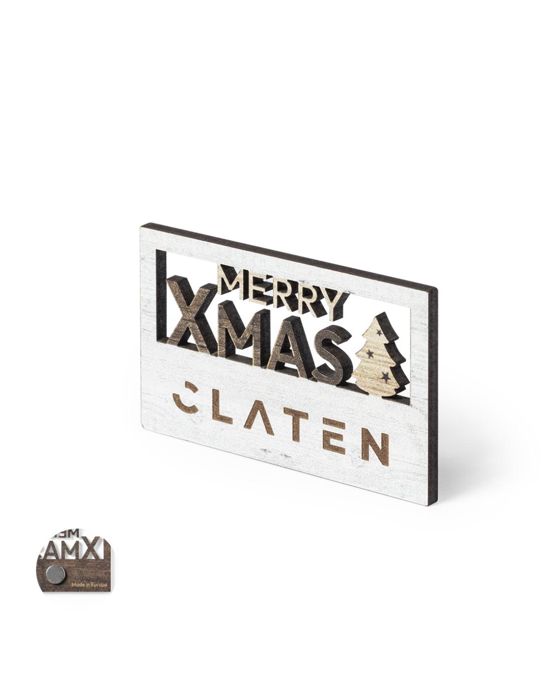 Original imán Merry Christmas fabricado en madera natural, con texto troquelado y de original acabado bicolor. Amplia superficie de marcaje y distintivo Made In Europe.