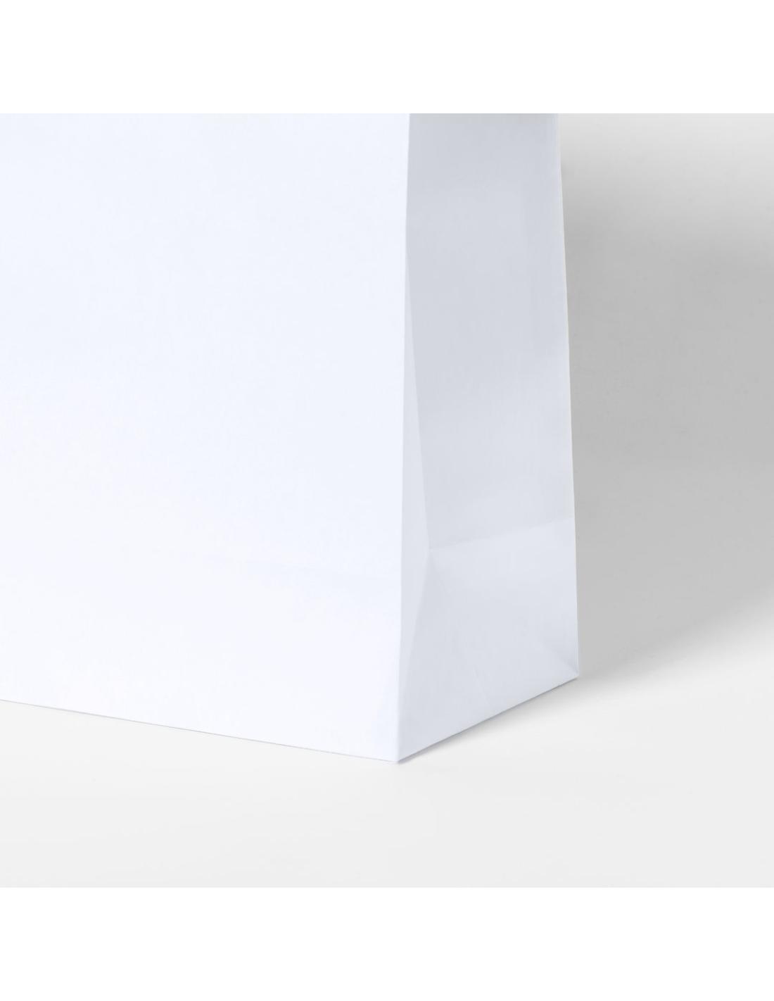 Bolsa de línea nature, fabricada en papel reciclado acabado en blanco de 100g/m2, con asas cortas reforzadas en tono natural y fuelle. Resistencia hasta 6 kg de peso.