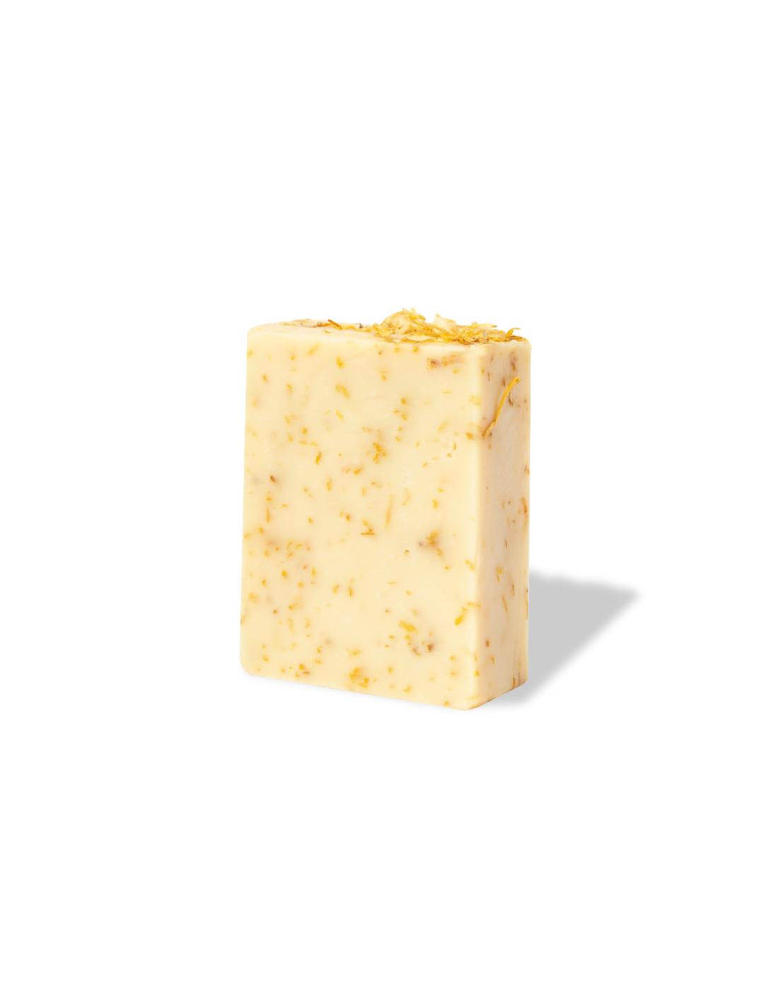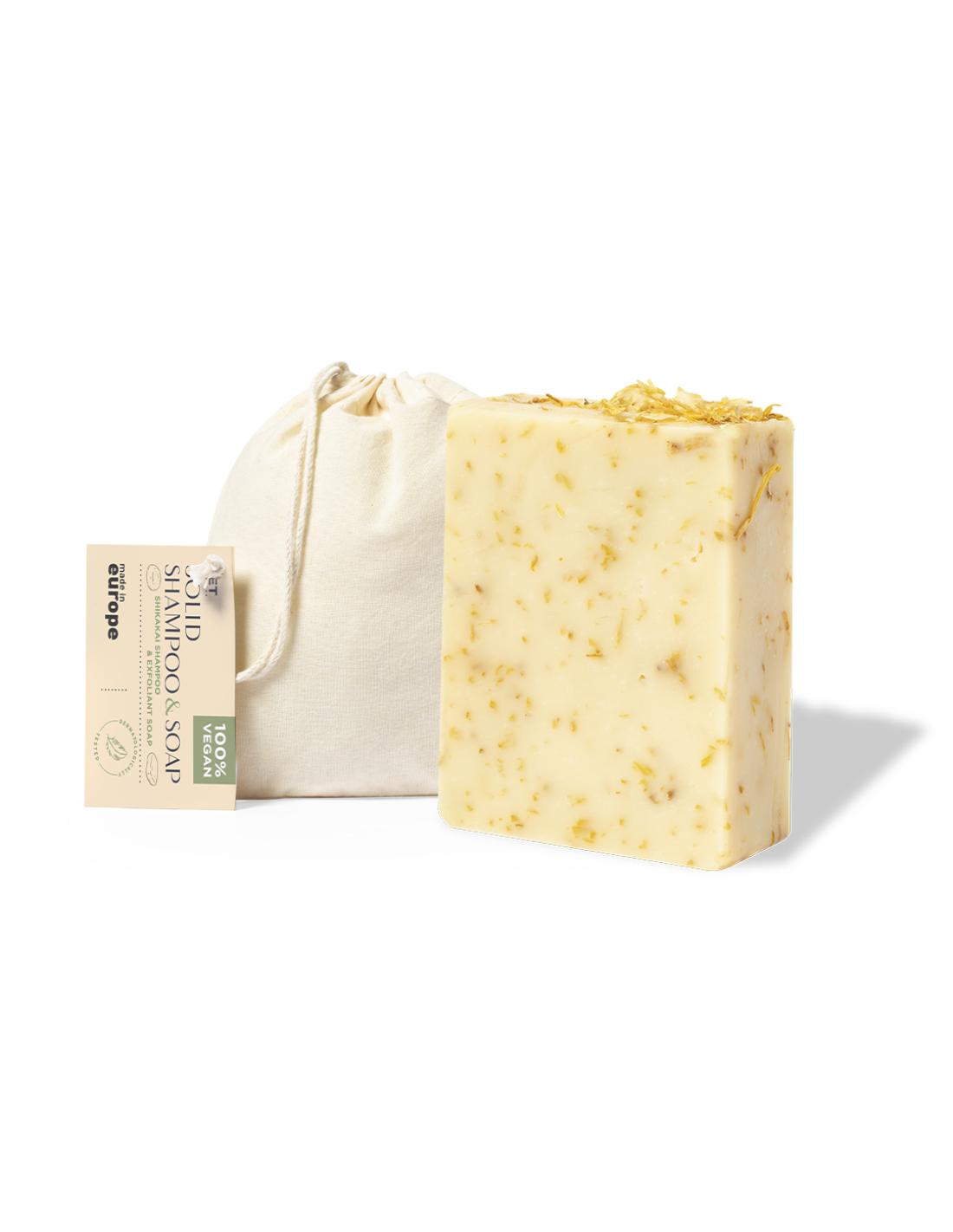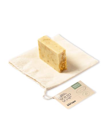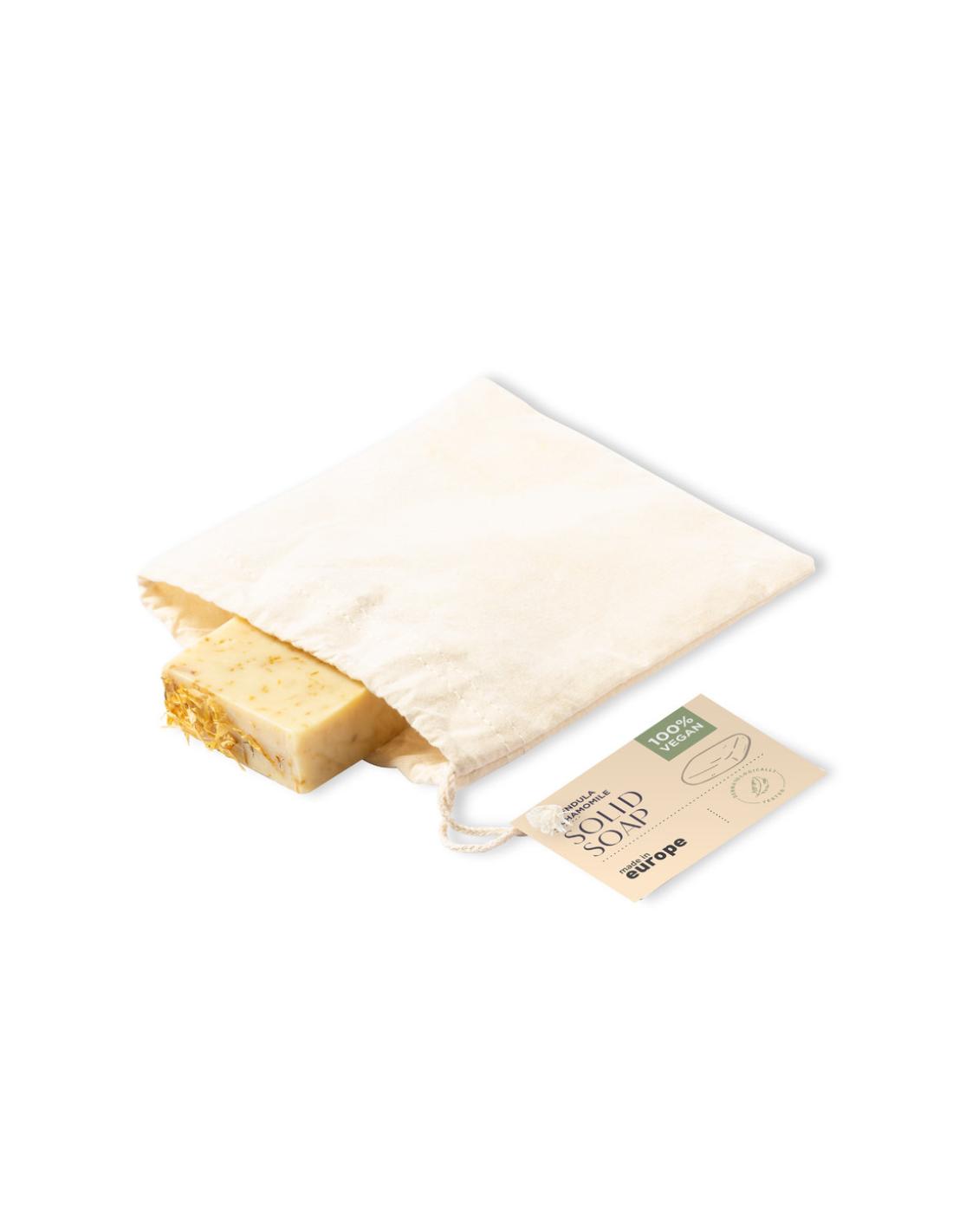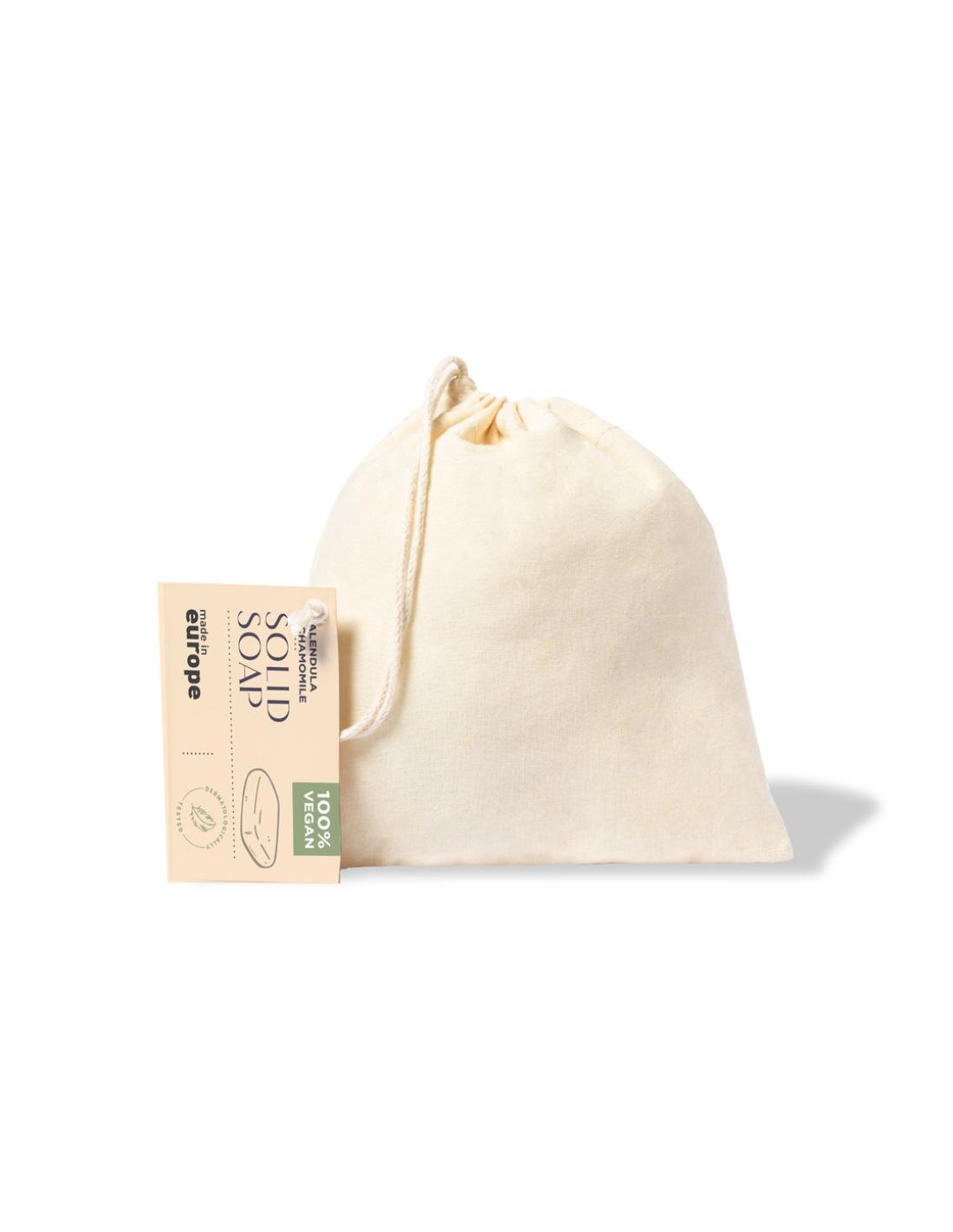 Pastilla de jabón vegano de 100 gr. Aroma de caléndula y manzanilla con propiedades calmantes, hidratantes y reparadoras. Dermatológicamente testado y de fabricación europea. Presentación en bolsa individual de algodón, con cierre de cordón y etiqueta distintiva. Producto sostenible y 100% vegano, sin ingredientes de procedencia animal. Además, no se han realizado pruebas de estos productos en animales, promoviendo el cuidado y respeto de todos ellos.