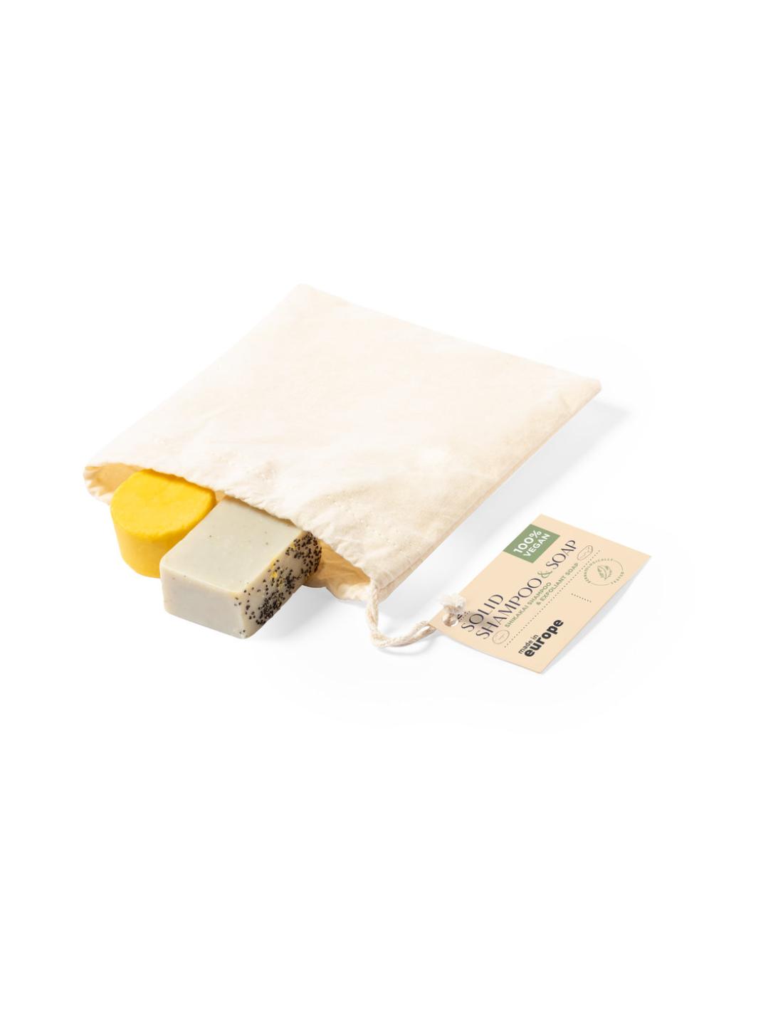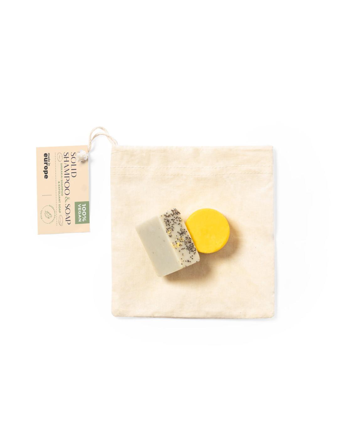 Set vegano de jabón y champú sólidos. Contenido: Pastilla de jabón botánico de 50 gr, elaborada con ingredientes de cultivo ecológico. Con propiedades reguladoras y purificantes. Champú sólido Shikakai de 30 gr, elaborado con una selección de ingredientes activos como la oliva virgen, manteca de karité bio, zanahoria y extractos botánicos de shikakai. Rico en vitamina E, aportando al cabello limpieza, sedosidad y vigor. De agradable fragancia que aporta un estado de placer y bienestar interior. Presentación en bolsa individual de algodón, con cierre de cordón y etiqueta distintiva. Dermatológicamente testado y de fabricación europea. Producto sostenible y 100% vegano, sin ingredientes de procedencia animal. Además, no se han realizado pruebas de estos productos en animales, promoviendo el cuidado y respeto...