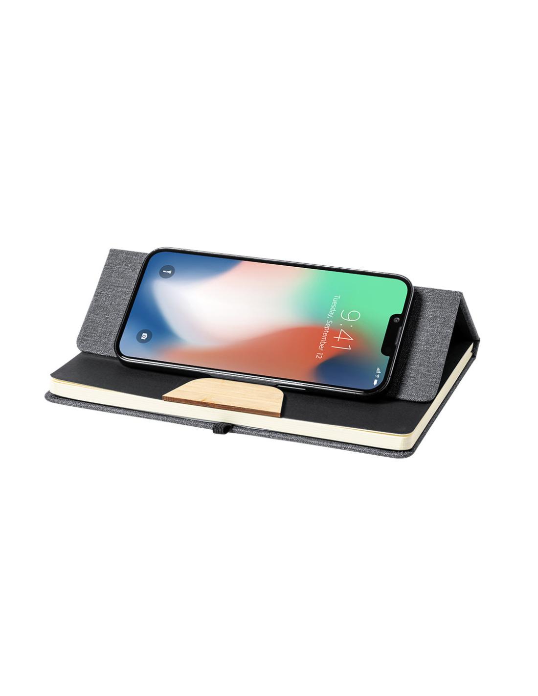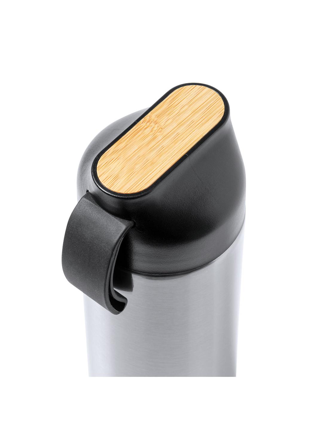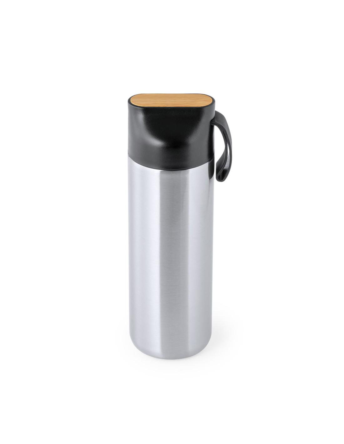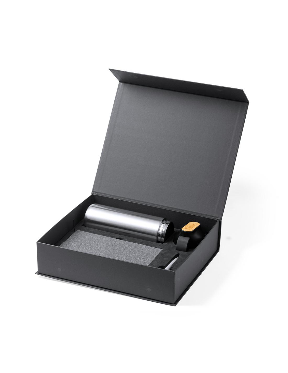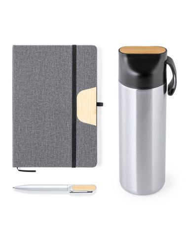 Elegante set premium que incluye: Termo de doble capa en acero inoxidable de acabado mate y de 640 ml de capacidad, con detalle de bambú en el tapón para marcaje. Bloc de notas en suave polipiel, con soporte para smartphone integrado en la portada y detalle en bambú para marcaje. Incluye cierre elástico, marcapáginas y soporte para bolígrafo a juego. Interior con 80 hojas de disposición a una raya. Bolígrafo en aluminio de acabado mate con detalle en bambú para marcaje, de mecanismo giratorio y tinta azul. Presentado en estuche individual de acabado mate y cierre magnético, con troquelado interior para cada uno de los elementos del set.