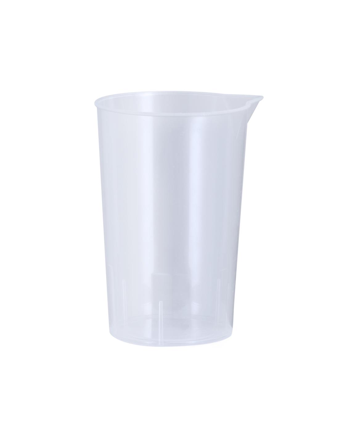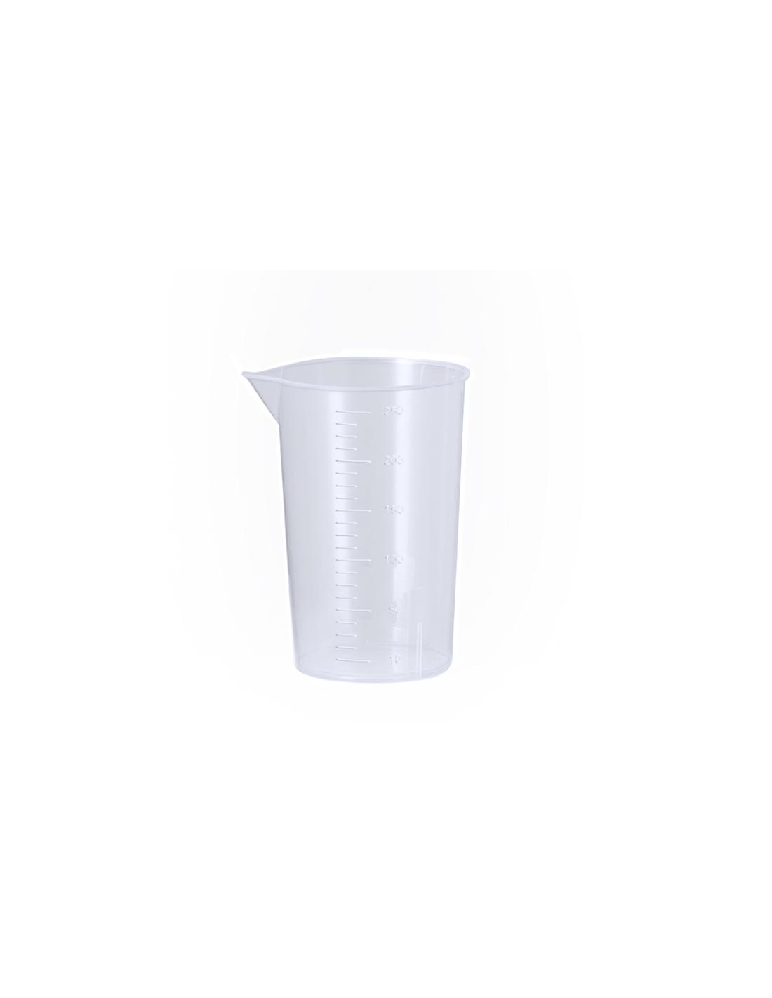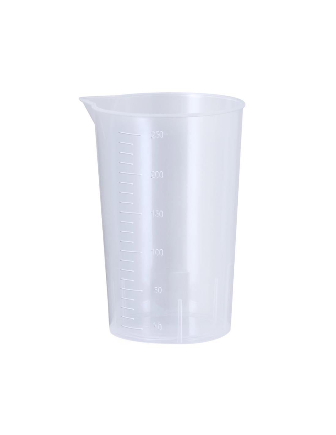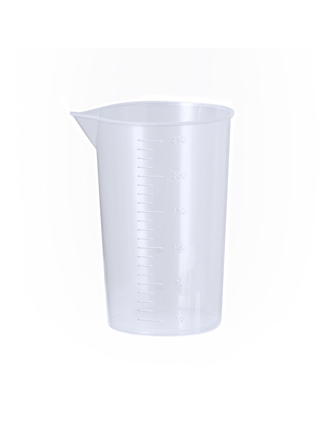 Vaso medidor de 250 ml fabricado en resistente PP transparente. Con medidor lateral en tramos de 10 ml y vertedor en el borde para evitar derrames.