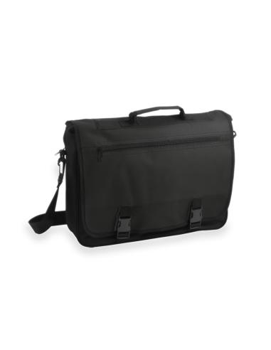 Portadocumentos con solapa de cierre de velcro en poliéster 600D con elegante tira frontal en color negro. Con asas de transporte reforzadas y cinta bandolera ajustable. Compartimentos interiores para bolígrafos y funda para smartphone en PVC con función táctil.