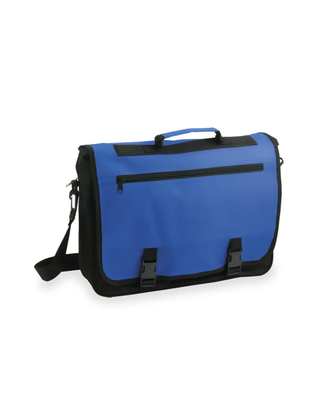 Portadocumentos con solapa de cierre de velcro en poliéster 600D con elegante tira frontal en color negro. Con asas de transporte reforzadas y cinta bandolera ajustable. Compartimentos interiores para bolígrafos y funda para smartphone en PVC con función táctil.