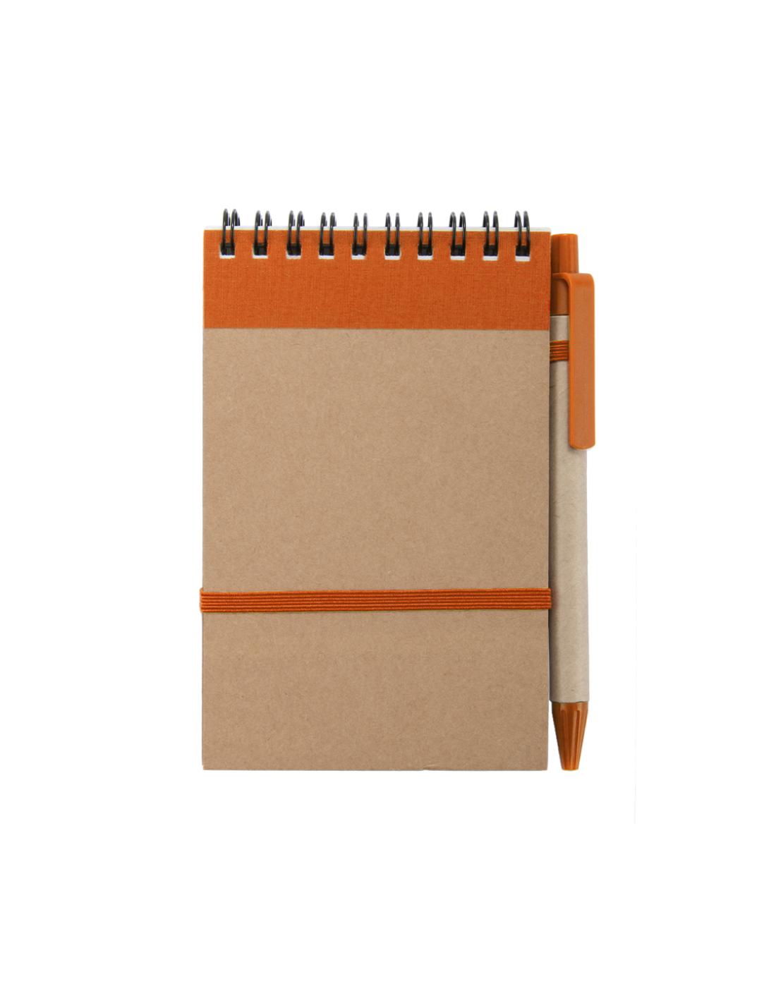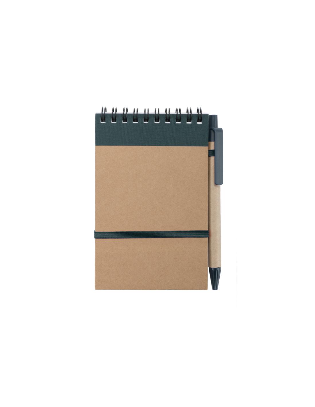 Libreta de anillas hecha de resistente cartón reciclado bicolor con suaves tapas, elástico de sujeción en portada y bolígrafo en cartón reciclado a juego. En atrevidos colores.