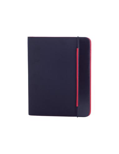 Carpeta de diseño bicolor en vivos colores acabada en suave microfibra y con cierre elástico. Interior a juego con bloc extraíble de 20 hojas lisas, bolsillo de solapa, tarjeteros y soporte para bolígrafo.