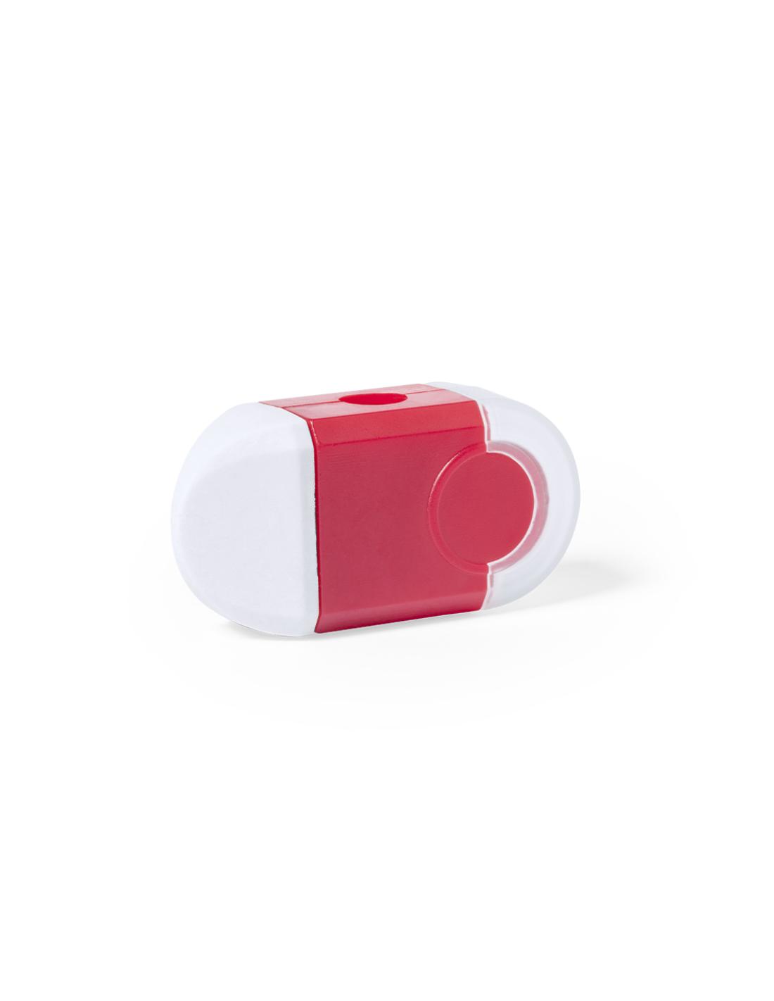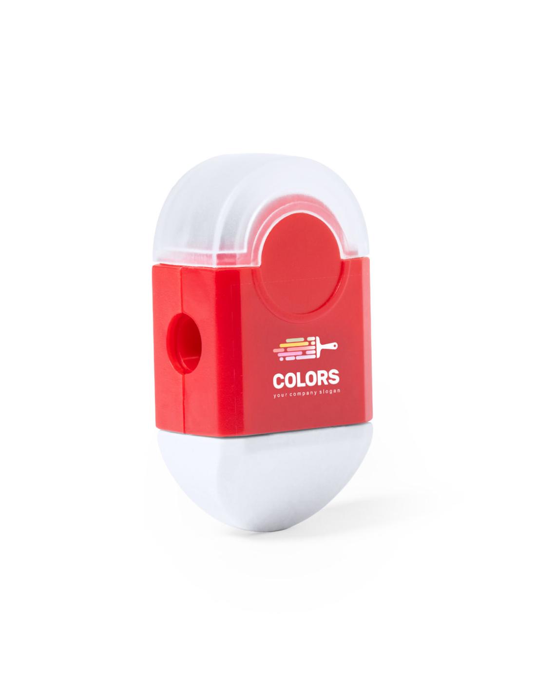 Set de goma y sacapuntas en vivos colores. Compartimento para residuos con capucha transparente.