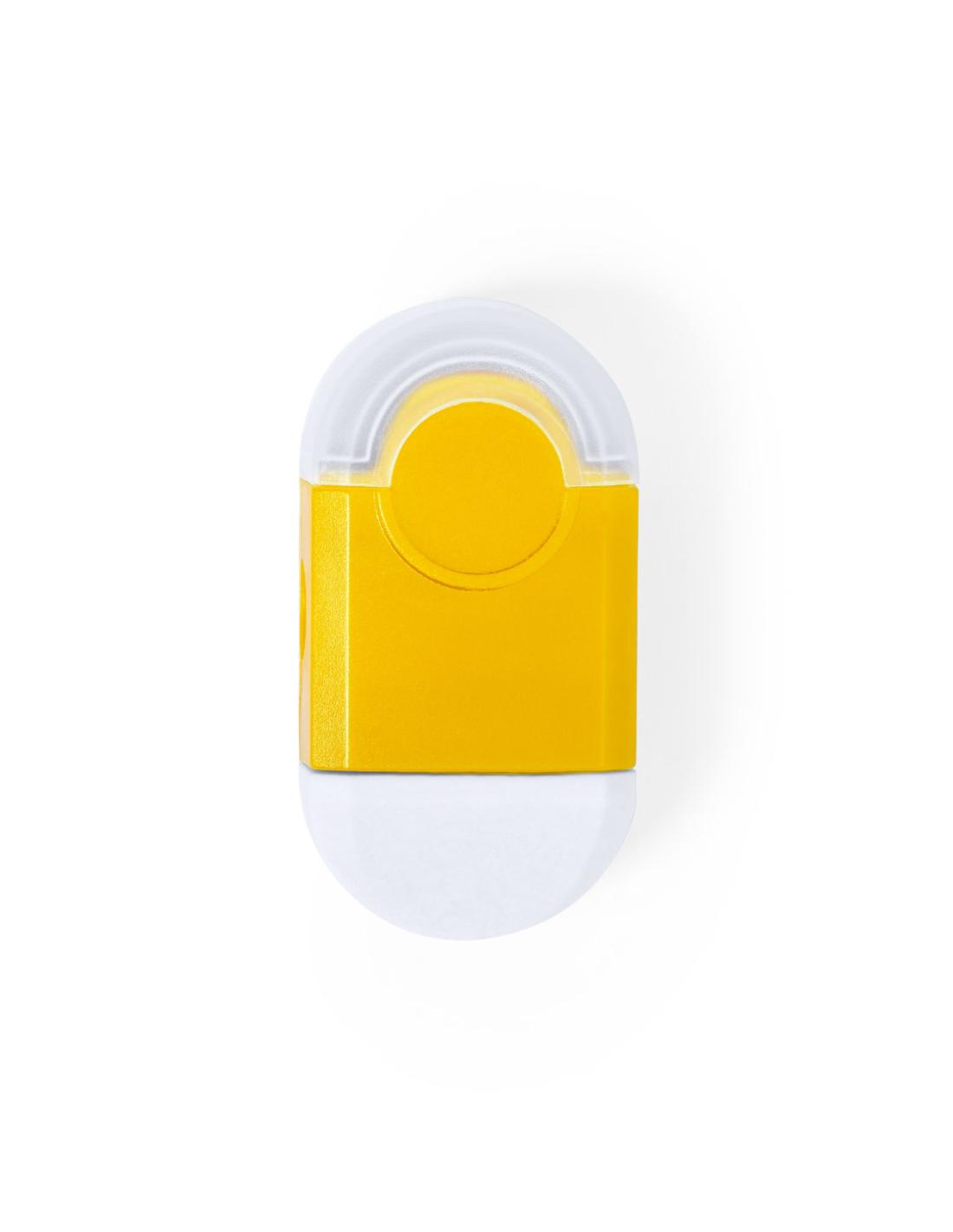 Set de goma y sacapuntas en vivos colores. Compartimento para residuos con capucha transparente.