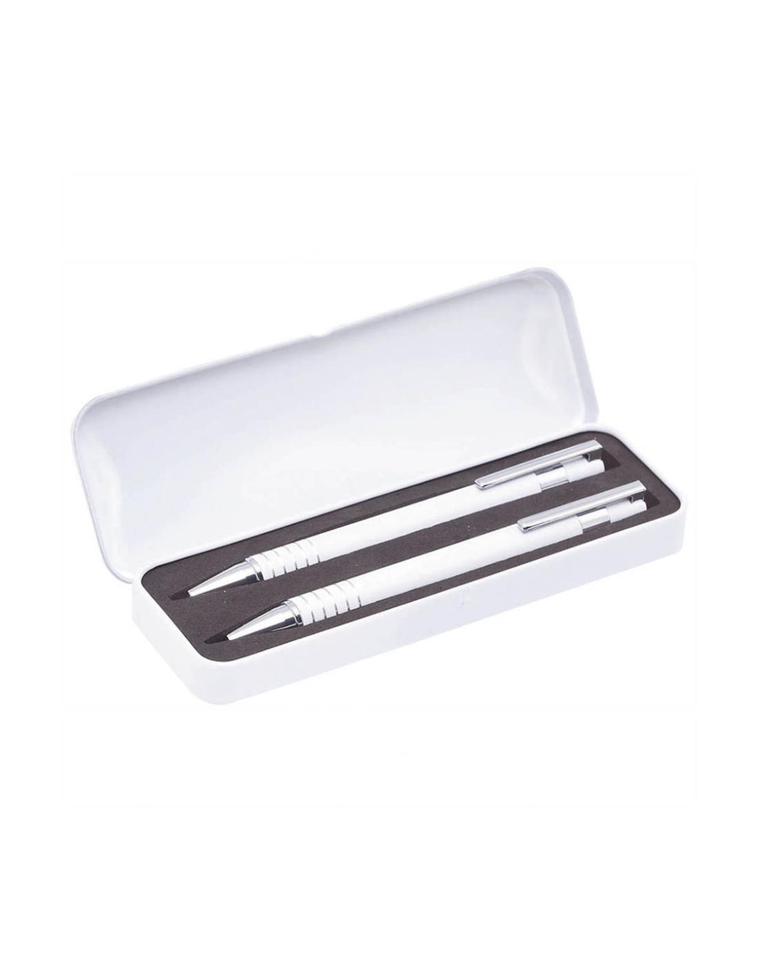 Set de bolígrafo de mecanismo pulsador y portaminas en original diseño bicolor. De cuerpo metálico en suave acabado de vivos colores y accesorios en colores plateados. Con empuñadura anillada y presentado en resistente estuche individual metálico a juego con suave espuma troquelada. Bolígrafo de cartucho jumbo con tinta azul y portaminas con minas de 0,7mm incluidas.