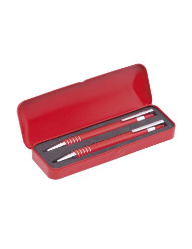 Set de bolígrafo de mecanismo pulsador y portaminas en original diseño bicolor. De cuerpo metálico en suave acabado de vivos colores y accesorios en colores plateados. Con empuñadura anillada y presentado en resistente estuche individual metálico a juego con suave espuma troquelada. Bolígrafo de cartucho jumbo con tinta azul y portaminas con minas de 0,7mm incluidas.