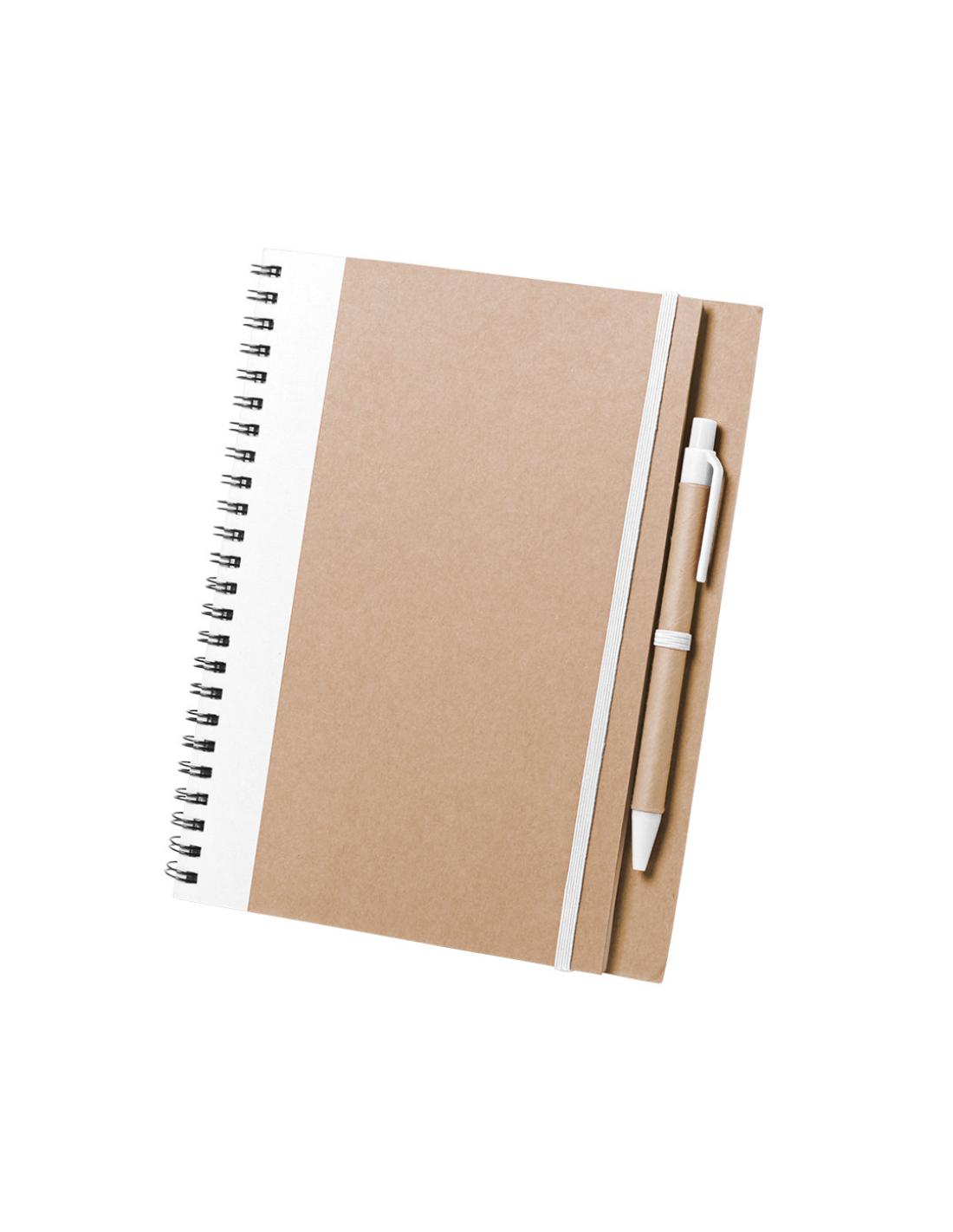 Libreta de anillas de línea nature fabricada en cartón reciclado. Con tapas duras de colores bitonos en color natural y extensa variedad de colores. Cuenta con un elástico de cierre, soporte para bolígrafo a juego y bolígrafo de cartón reciclado