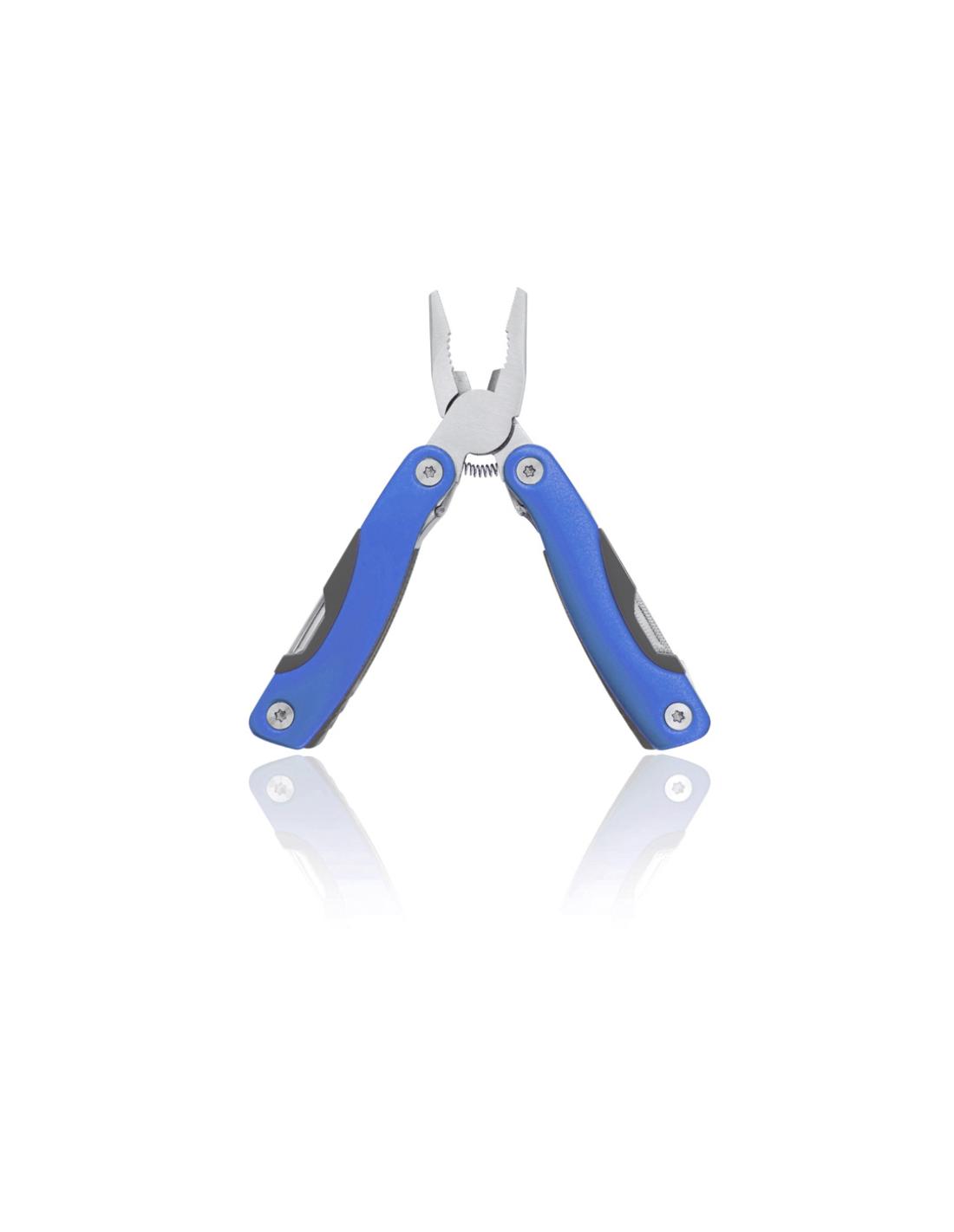 Multiherramienta con resistente cuerpo en acero inox de 12 funciones. Incluye cuchillo plano, cuchillo de sierra, destornilladores, lima, abridor y alicates. Disponible en variada gama de colores y presentada en resistente funda de poliéster y en caja individual.