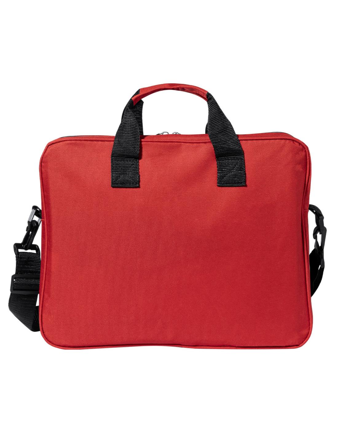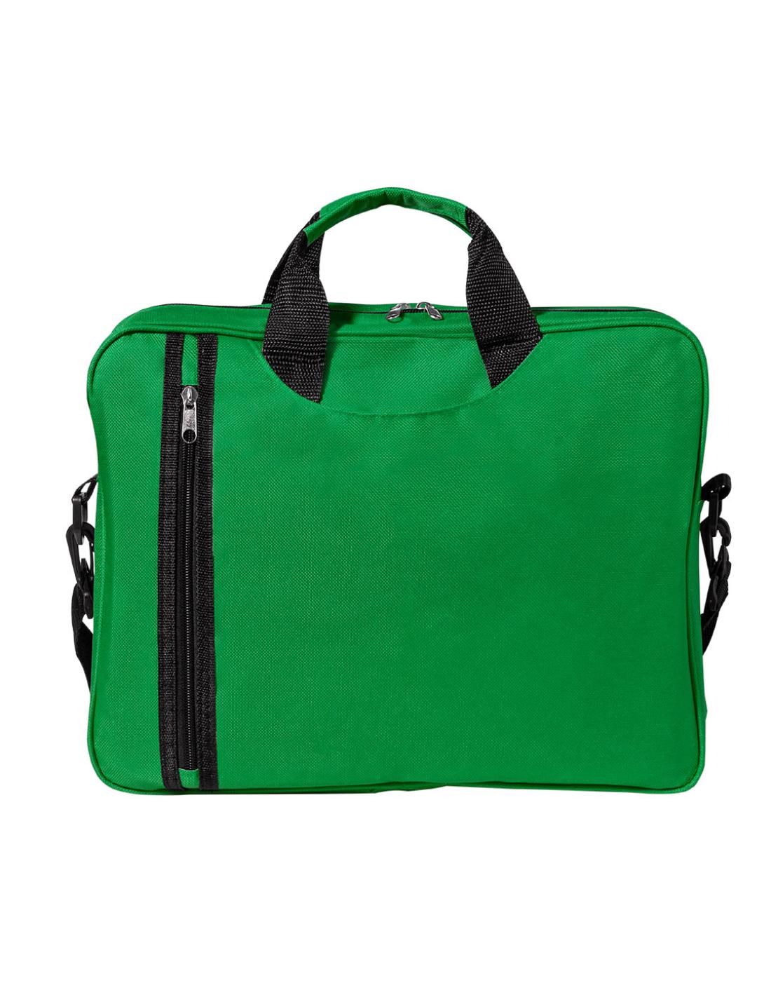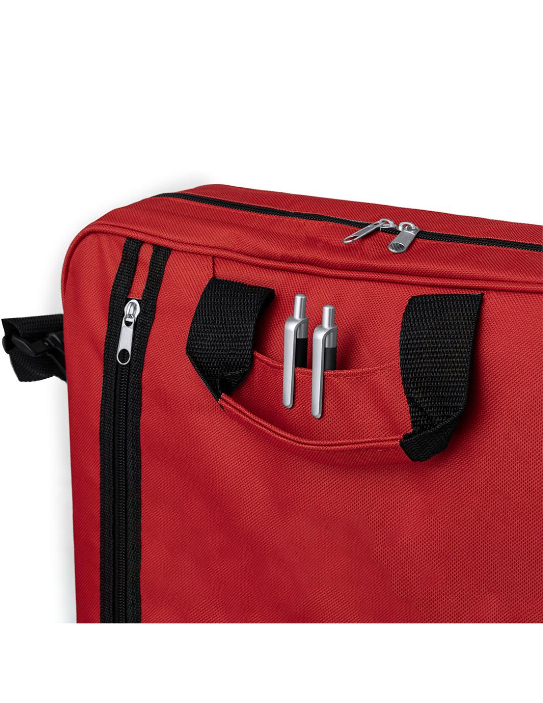 Portadocumentos de cierre de cremallera con original bolsillo frontal en vertical y compartimento bajo las asas en suave acabado de poliéster 600D en vivos colores. Con asas de transporte reforzadas a juego y cinta bandolera ajustable con cierres de mosquetón.