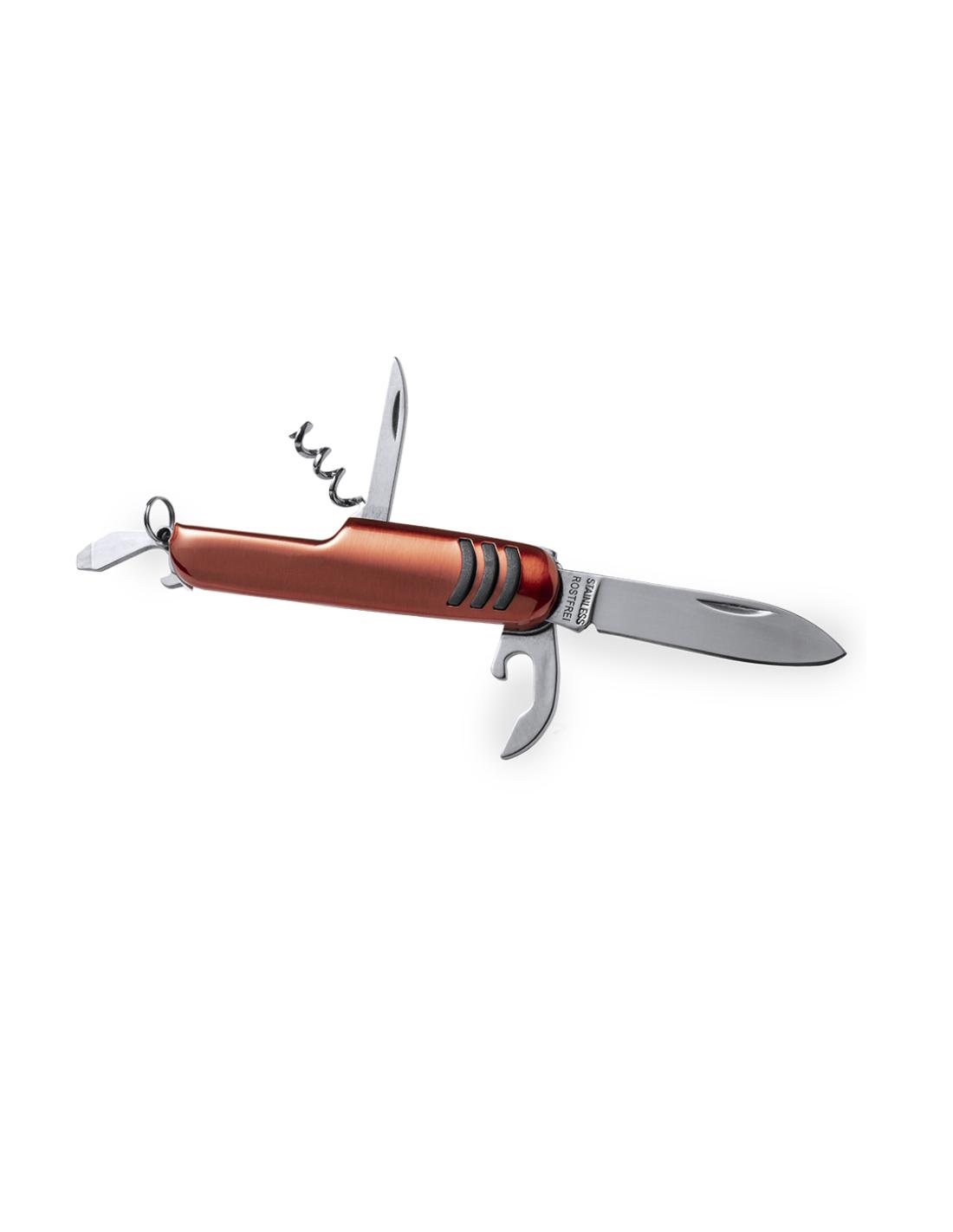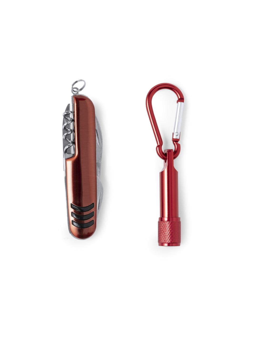 Set de aluminio de navaja multiusos con 7 funciones y linterna mosquetón. En variados colores y presentado en estuche individual con ventana y suave espuma interior troquelada. Pilas de botón incluidas.