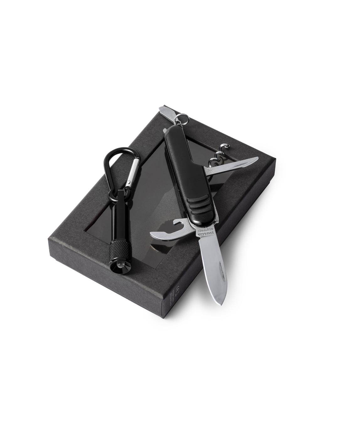 Set de aluminio de navaja multiusos con 7 funciones y linterna mosquetón. En variados colores y presentado en estuche individual con ventana y suave espuma interior troquelada. Pilas de botón incluidas.