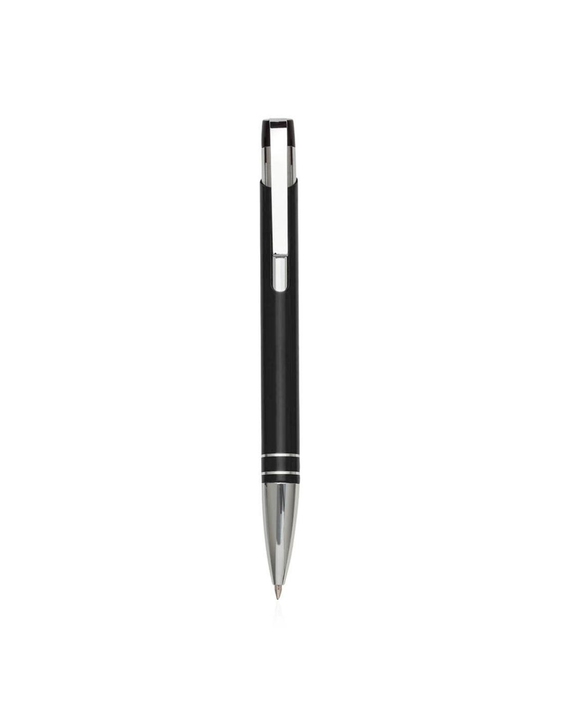 Original bolígrafo de mecanismo pulsador en elegante diseño bicolor. Con cuerpo troquelado en aluminio de suave acabado en variados colores. Original clip curvado, anillas y punta en plateado. De cartucho jumbo y tinta azul.