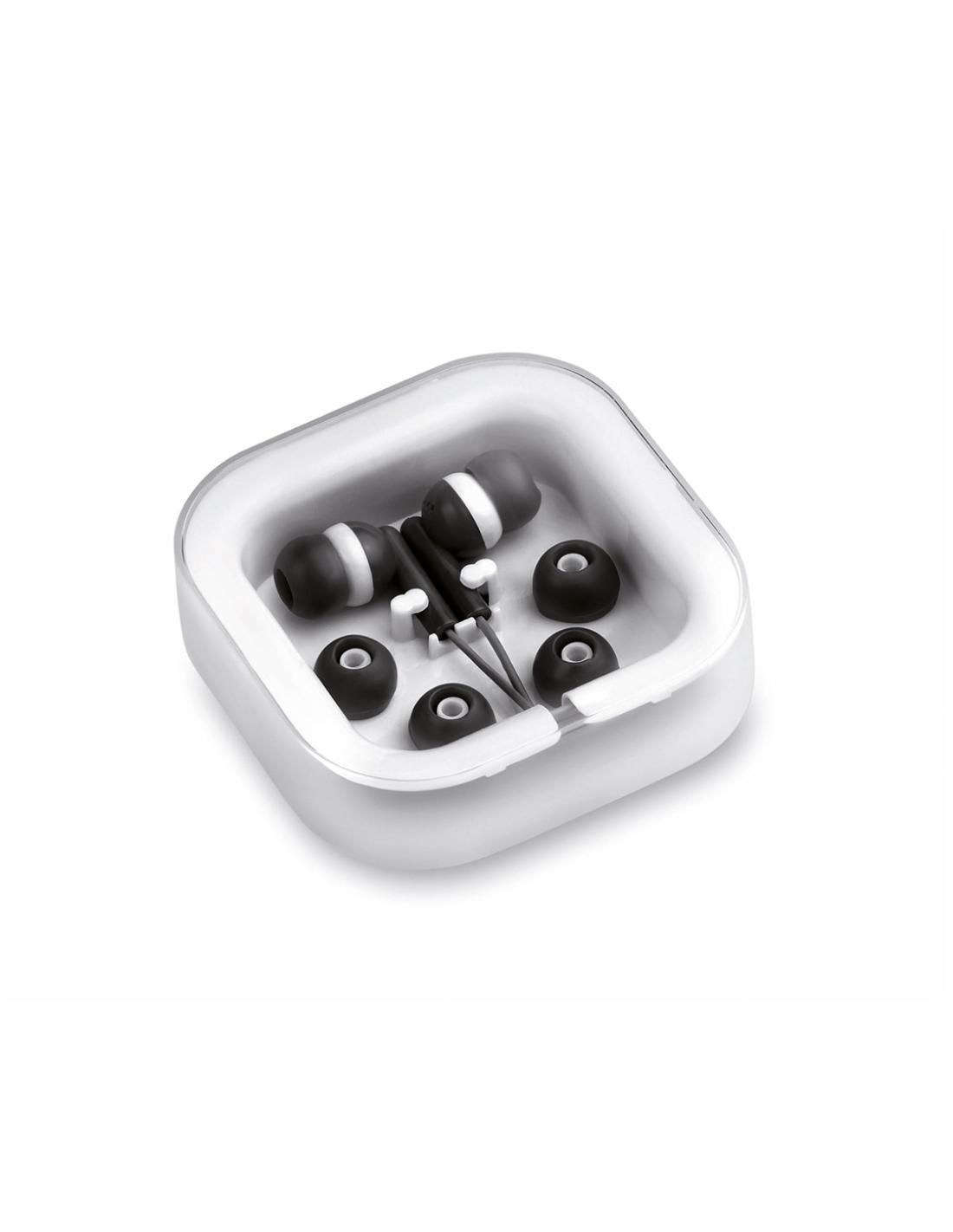 Prácticos y confortables auriculares intraurales de desenfadado diseño bicolor, conexión jack de 3,5mm y cable en color a juego. Disponible en variada gama de colores. Presentados en elegante estuche de diseño y con almohadillas de recambio.