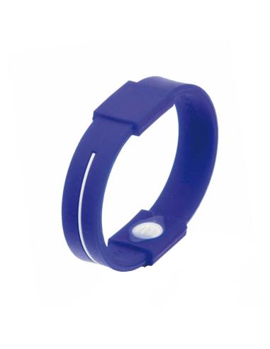 Pulsera de bienestar con tratamiento de iones y cuerpo acabado en suave silicona de vivos colores. Talla única de adulto y con pastilla para marcaje. Presentada en estuche individual con ventana en color negro.