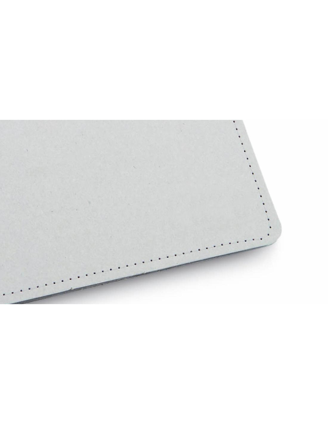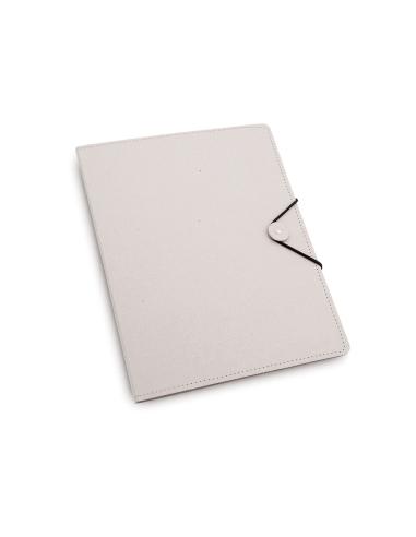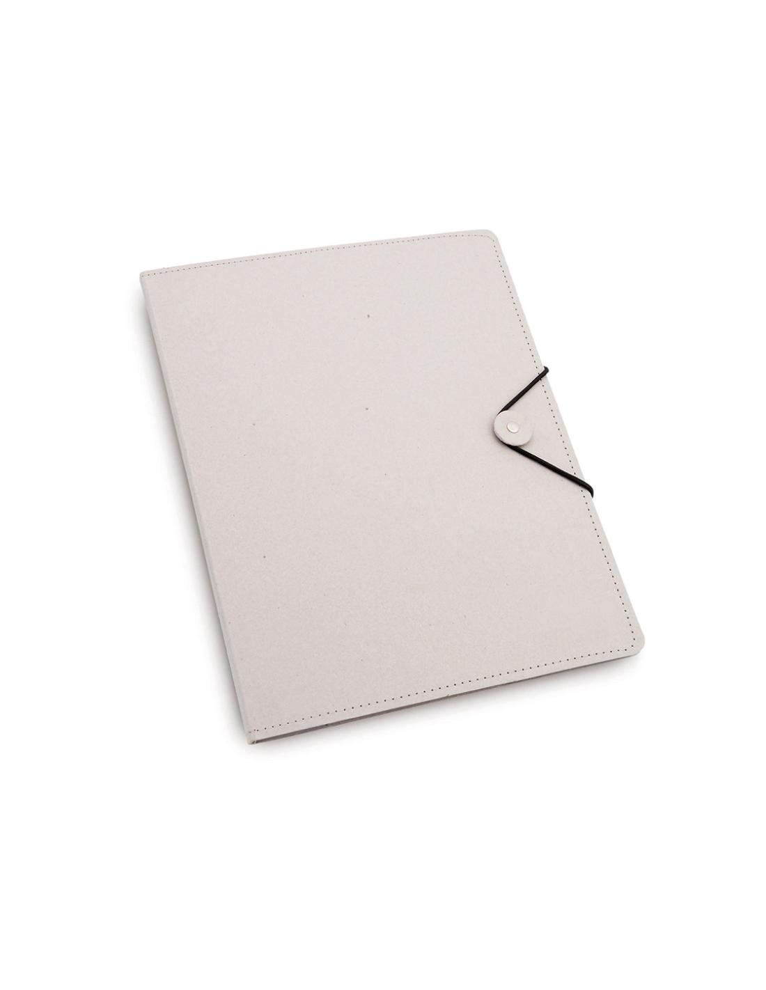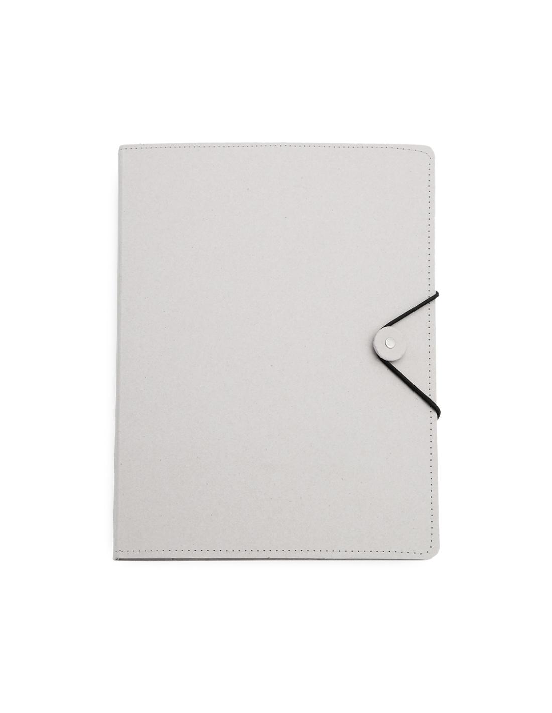Carpeta con original cierre elástico en resistente cartón reciclado de acabado rígido con costuras de refuerzo. Interior con bloc extraíble de 20 hojas con distribución a una raya, bolsillo triangular de solapa y soporte para bolígrafo.