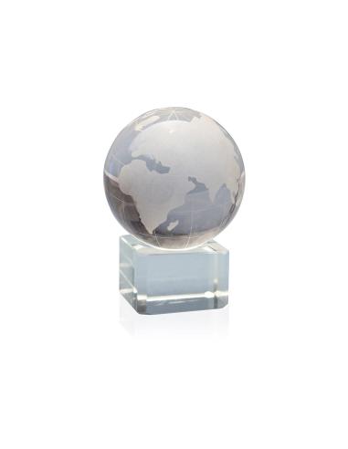 Bola de cristal con forma de planeta Tierra con base para marcaje en láser. Presentada en estuche de protección individual.