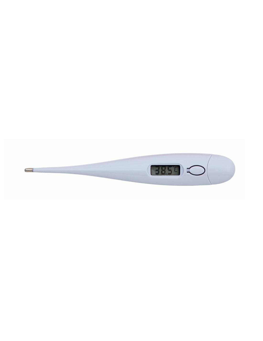 Termómetro digital de fácil uso en variada gama de colores. Presentado en resistente estuche transparente. Pilas de botón incluidas.