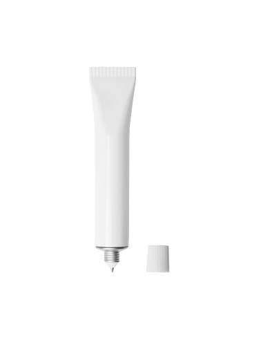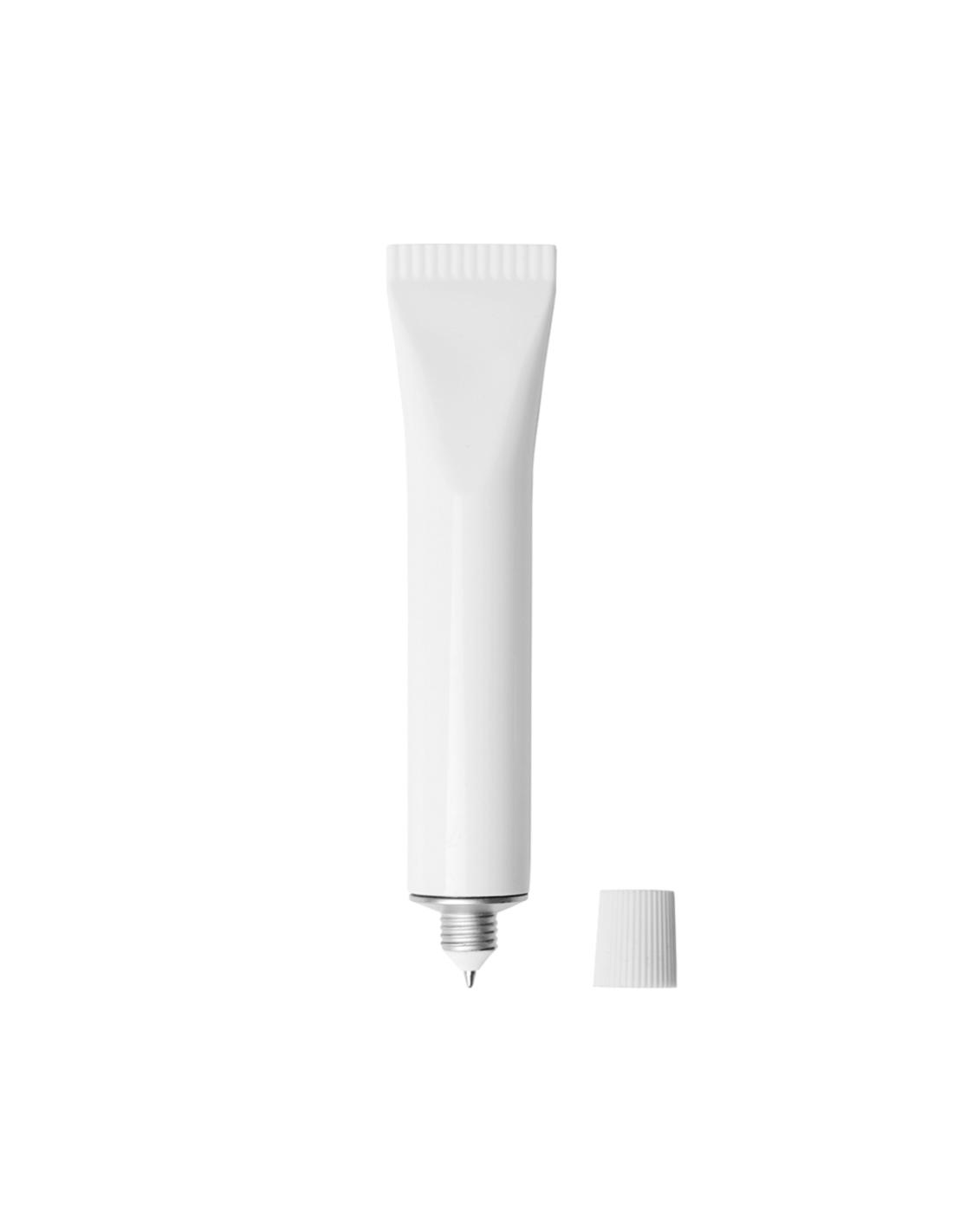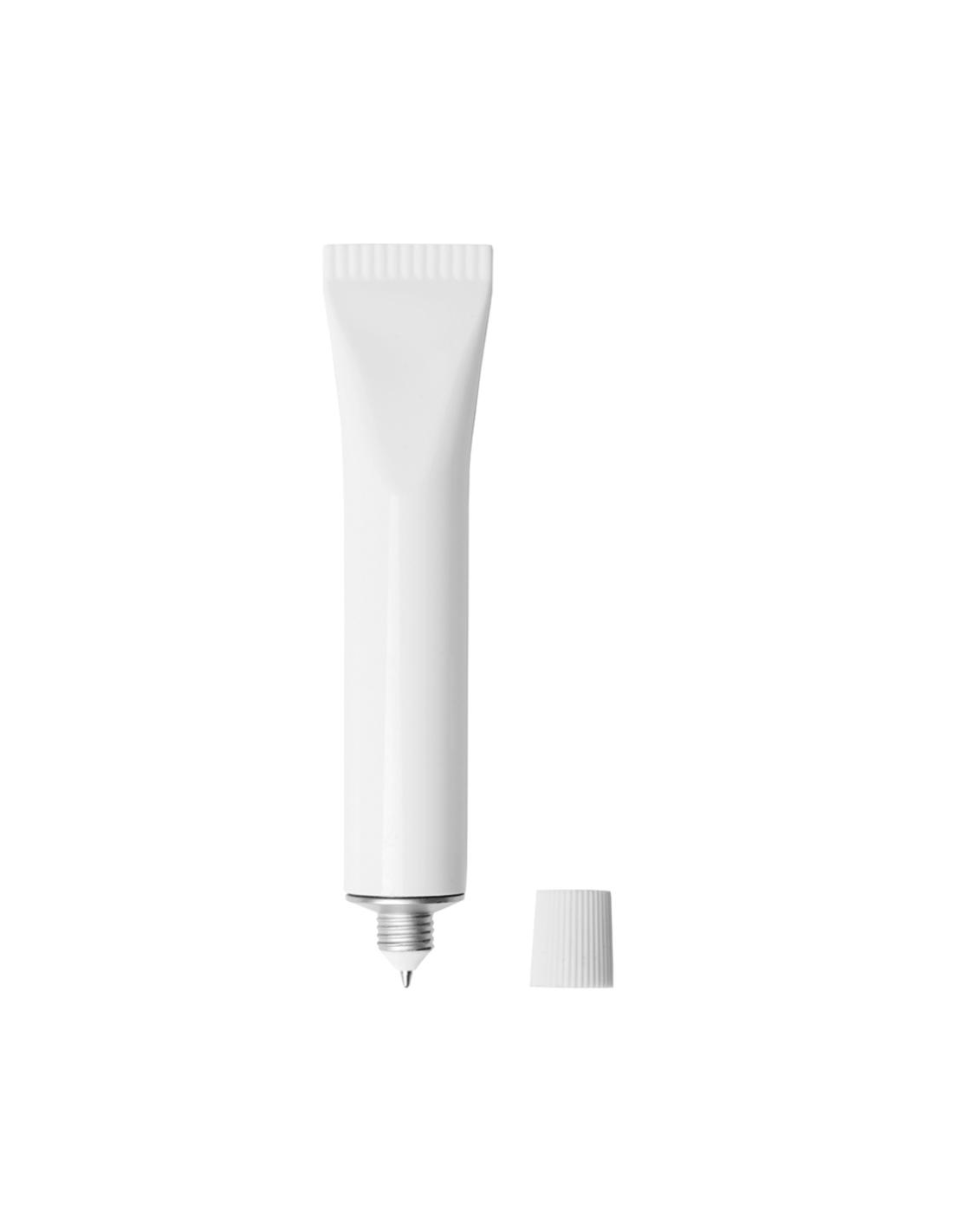 Original bolígrafo con diseño de tubo y cuerpo sólido en color blanco. Con capucha a rosca y de tinta azul.