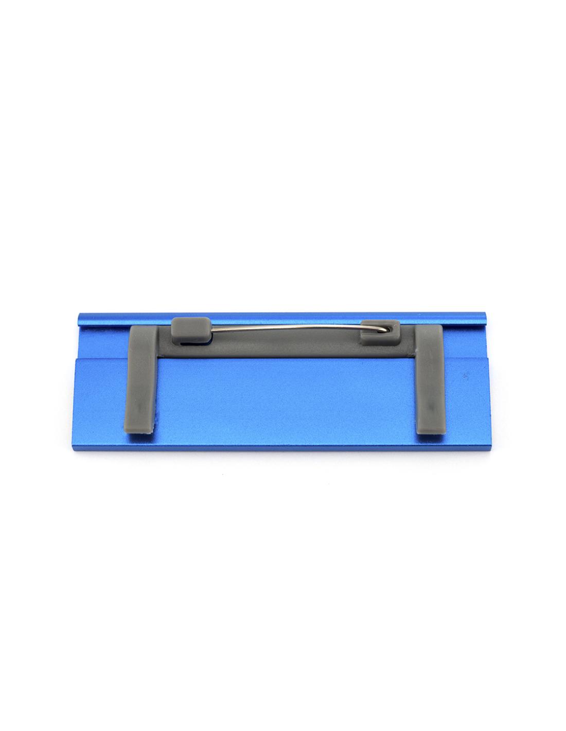 Identificador de aluminio en vivos colores y pinza trasera de enganche para una fijación segura.
