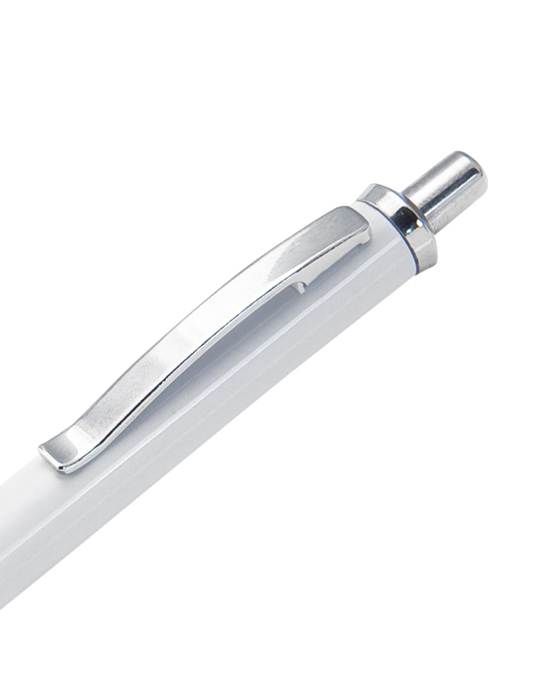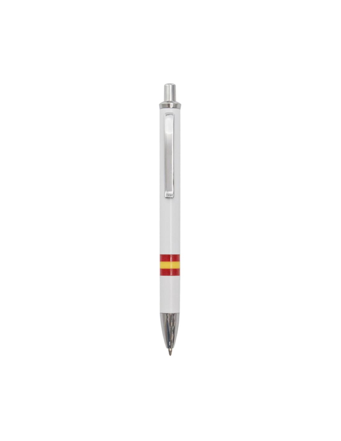 Bolígrafo de mecanismo pulsador de elegante diseño bicolor con accesorios en color plateado brillante y cuerpo de suave acabado en color blanco brillante con la bandera nacional. Con clip metálico, de cartucho jumbo y tinta azul.