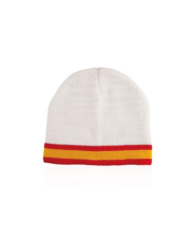 Suave y cálido gorro en combinación de materiales algodón y poliéster elástico de diseño España con doble cobertura. Disponible en colores azul y blanco.