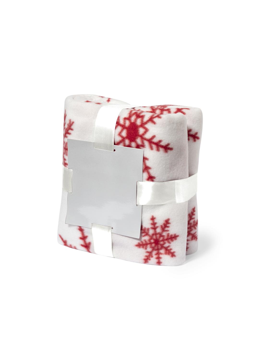 Manta de 130x160cm en original diseño de navidad de color rojo con motivos navideños en blanco. En suave y cálido material polar fleece de 200g/m2 con tratamiento antipilling. Presentada con cartón de color plateado y cinta lazo a juego en suave poliéster.