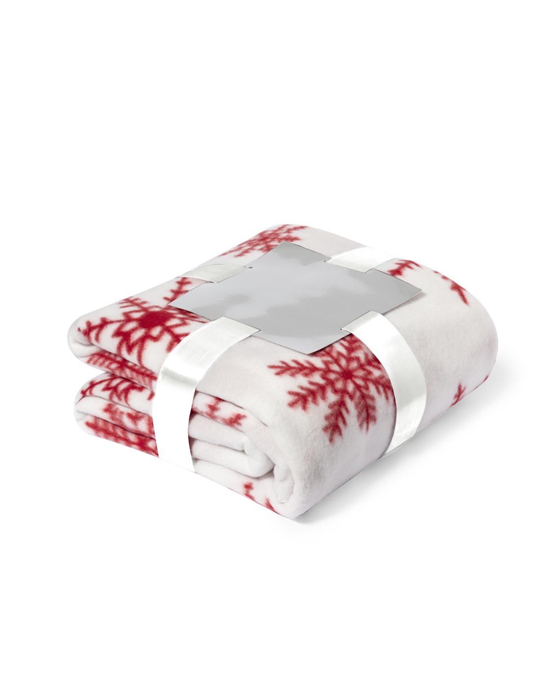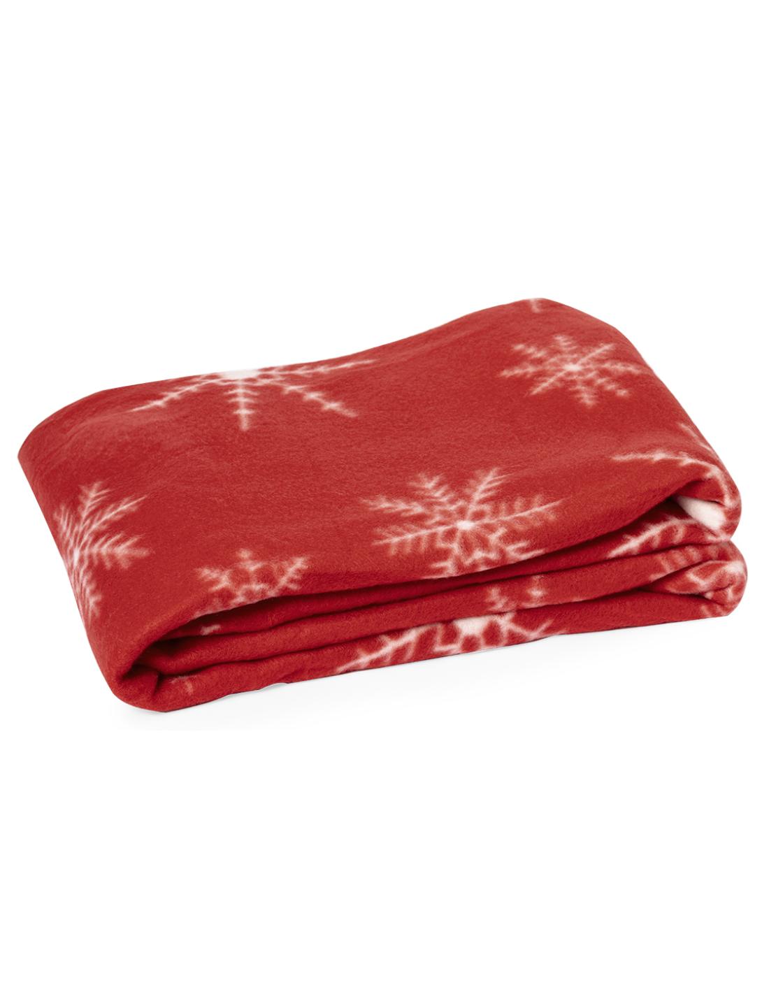 Manta de 130x160cm en original diseño de navidad de color rojo con motivos navideños en blanco. En suave y cálido material polar fleece de 200g/m2 con tratamiento antipilling. Presentada con cartón de color plateado y cinta lazo a juego en suave poliéster.