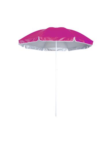 Sombrilla de playa de 8 paneles de resistente nylon e interior en color gris plateado con protección UV. En variada gama de vivos colores, de 150cm de diámetro, con faldones laterales ribeteados, tubos metalizados en color blanco y ajustable en altura. Presentada en funda de nylon con cinta de transporte para hombro.