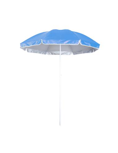 Sombrilla de playa de 8 paneles de resistente nylon e interior en color gris plateado con protección UV. En variada gama de vivos colores, de 150cm de diámetro, con faldones laterales ribeteados, tubos metalizados en color blanco y ajustable en altura. Presentada en funda de nylon con cinta de transporte para hombro.