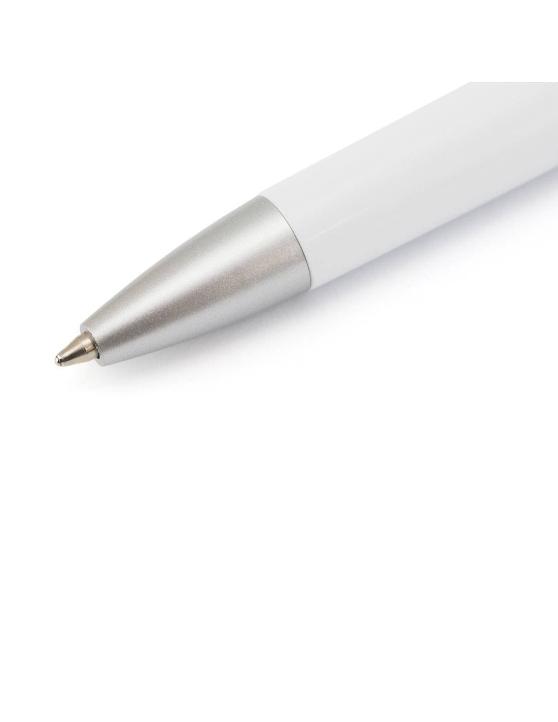 Bolígrafo de mecanismo pulsador de atrevido diseño tricolor con accesorios en vivos colores y cuerpo de suave acabado en color blanco sólido. Con original clip curvado a juego y cómoda empuñadura. Tinta azul.