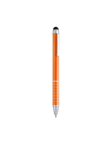 Bolígrafo puntero de mecanismo giratorio con cuerpo en aluminio de suave acabado metalizado en vivos colores. Accesorios y anillas en color plateado. Original empuñadura anillada y tinta azul.