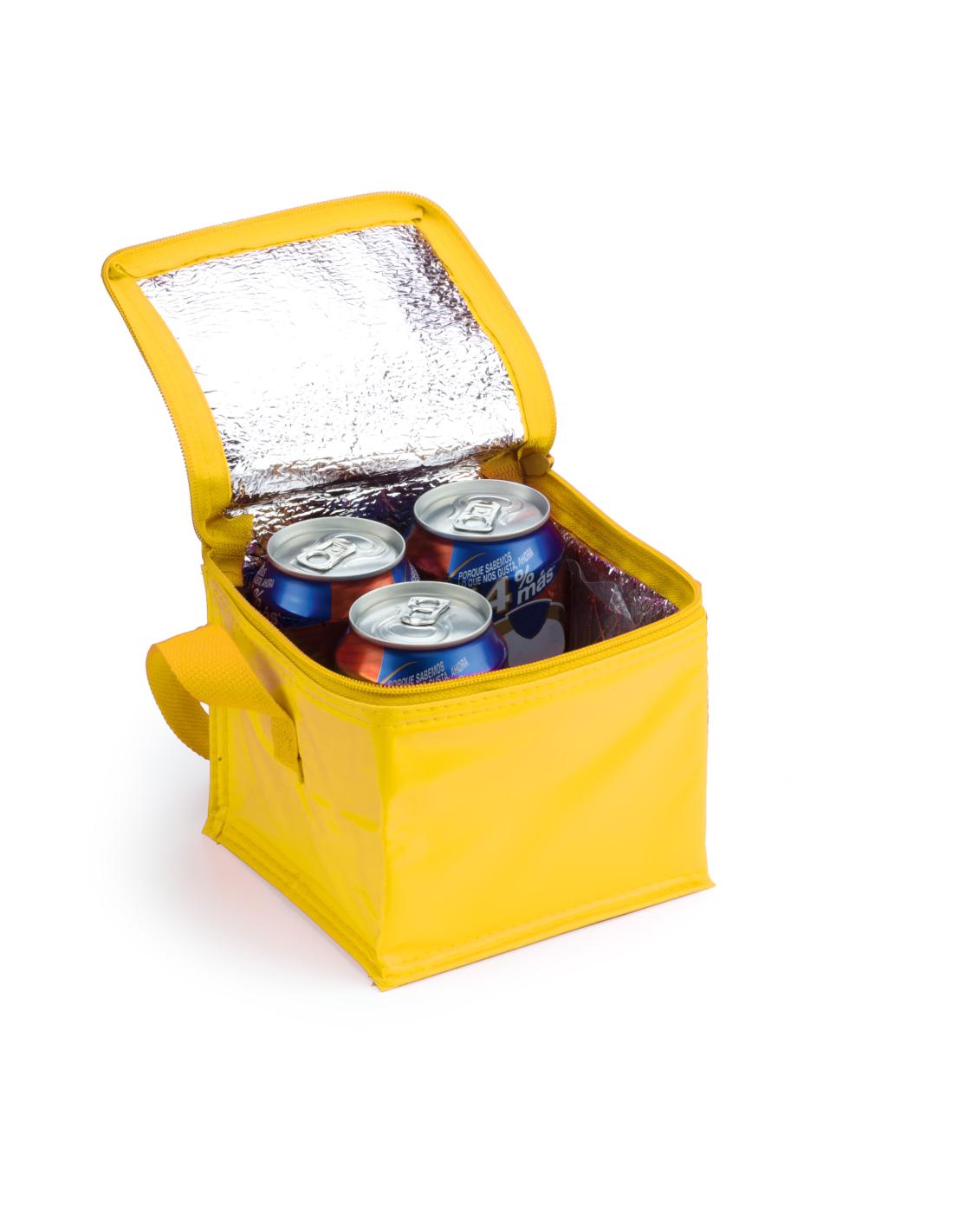 Nevera de 4 latas en resistente PVC de vivos colores. Interior isotermo en acabado de aluminio. Con cremallera y asa de transporte a juego.