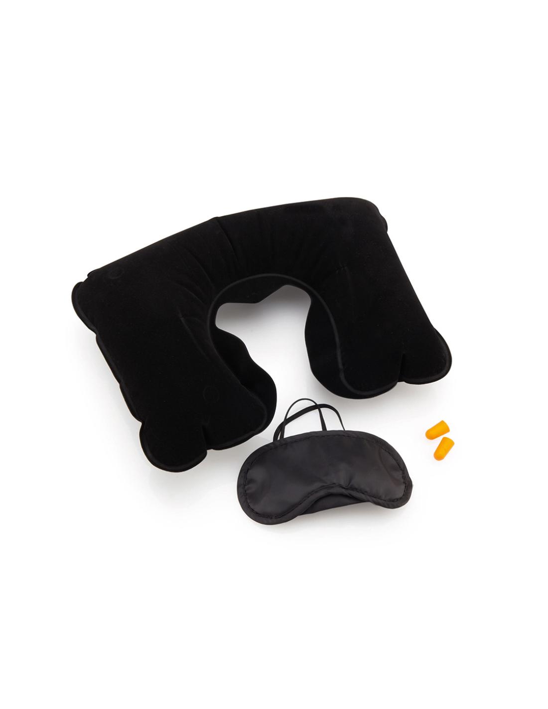 Set de viaje de 3 accesorios presentado en funda suave antelina en vivos colores. Incluye mascarilla en suave y confortable microfibra de acabado en color negro con doble elástico de ajuste a juego, almohadilla inflable para cuello en antelina y tapones en confortable material EVA de color naranja.