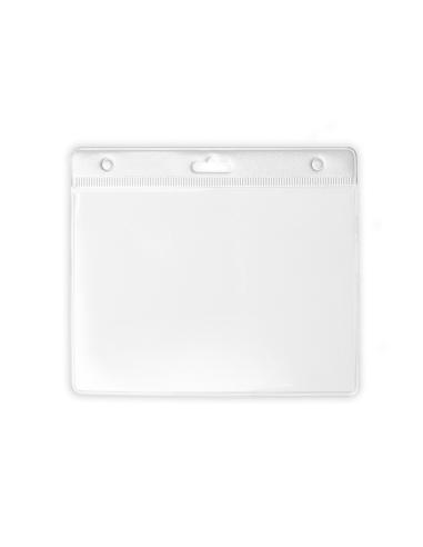 Identificador troquelado en PVC con cabecera en variados colores, ventana frontal transparente y parte trasera transparente.